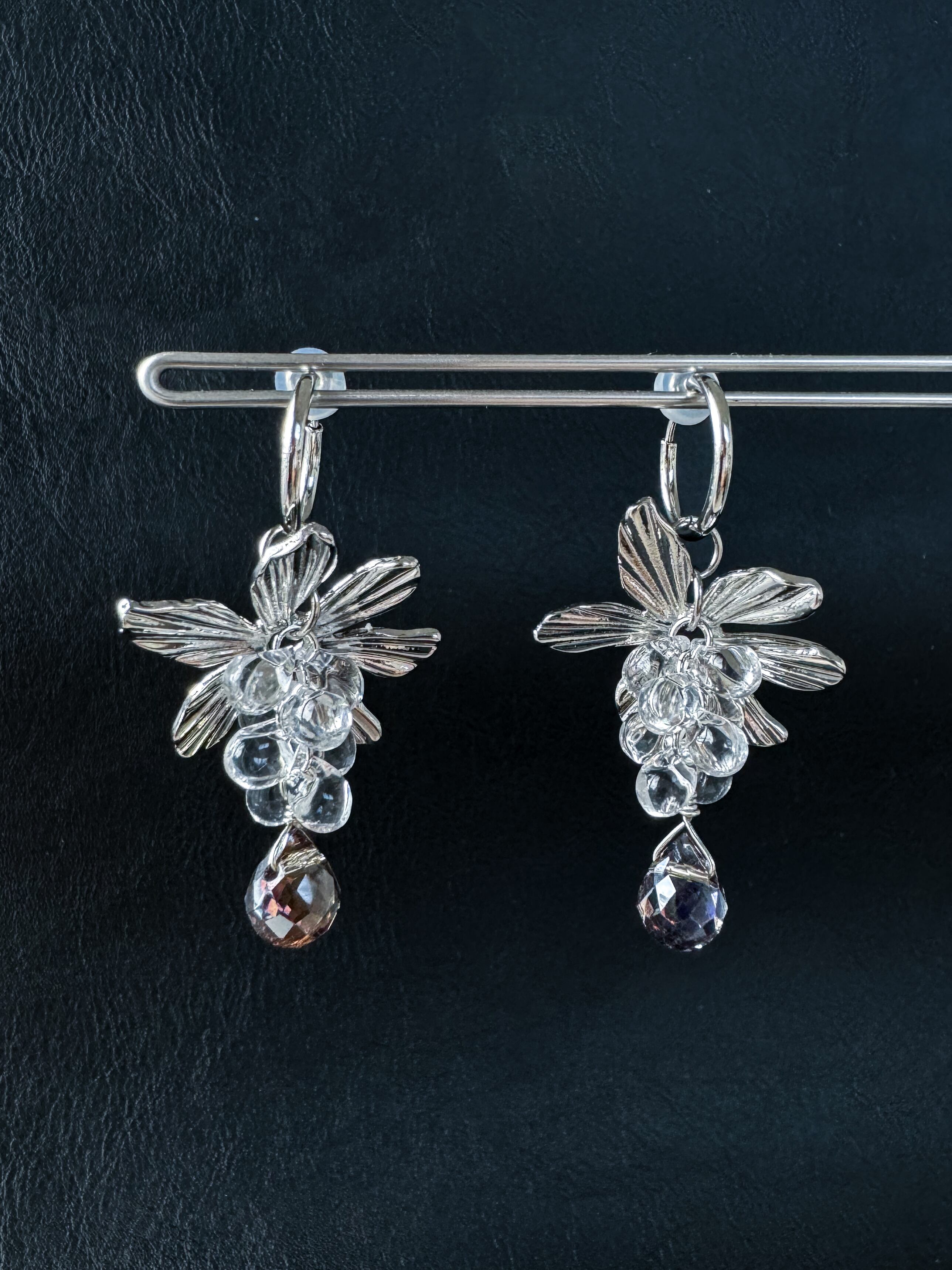 立体感のあるシルバーのお花が存在感を放ち、揺れる雫が耳元に繊細なきらめきを添えます。