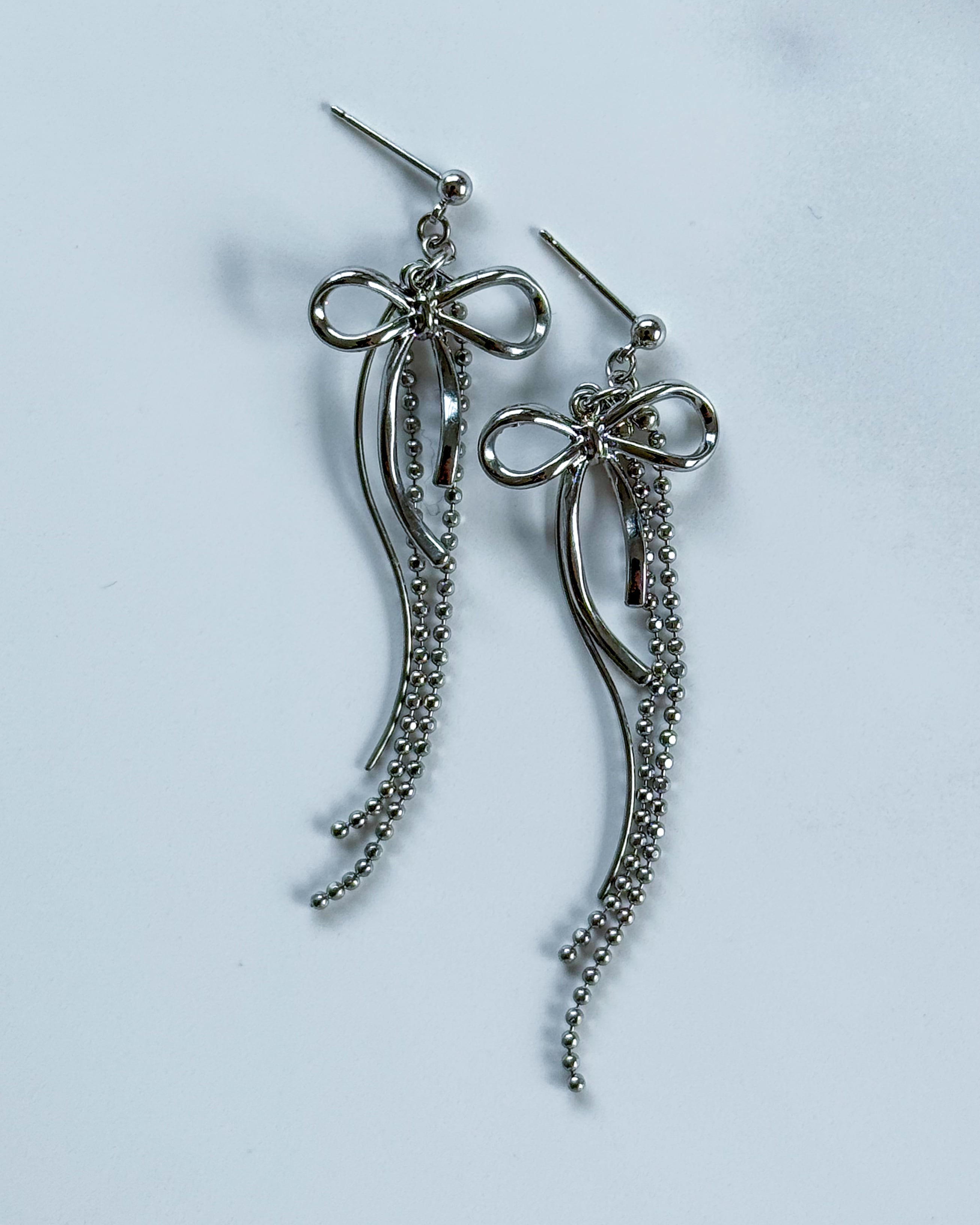 シルバーのリボンに、流星の軌跡を思わせるチェーンと曲線パーツを合わせた耳飾り。