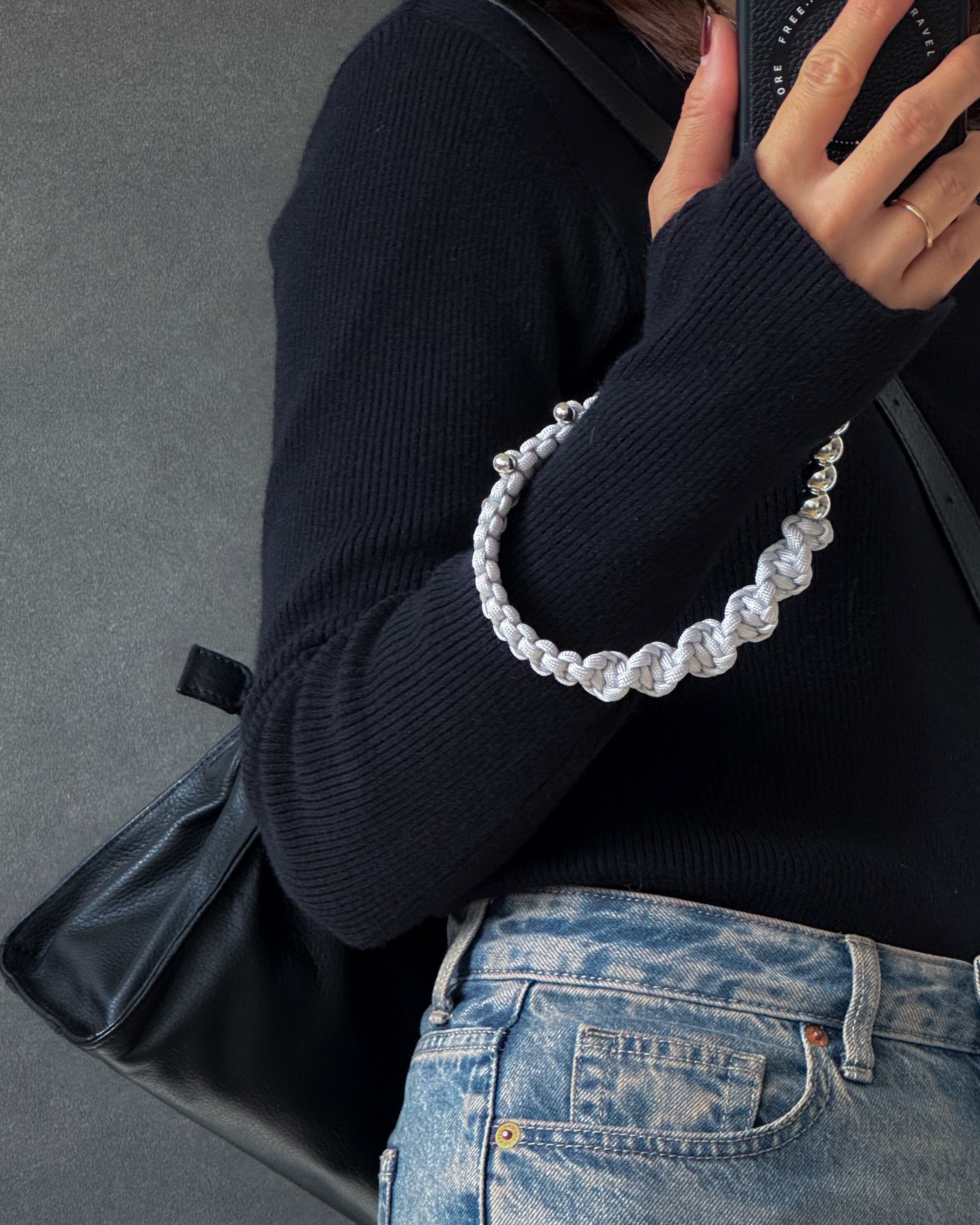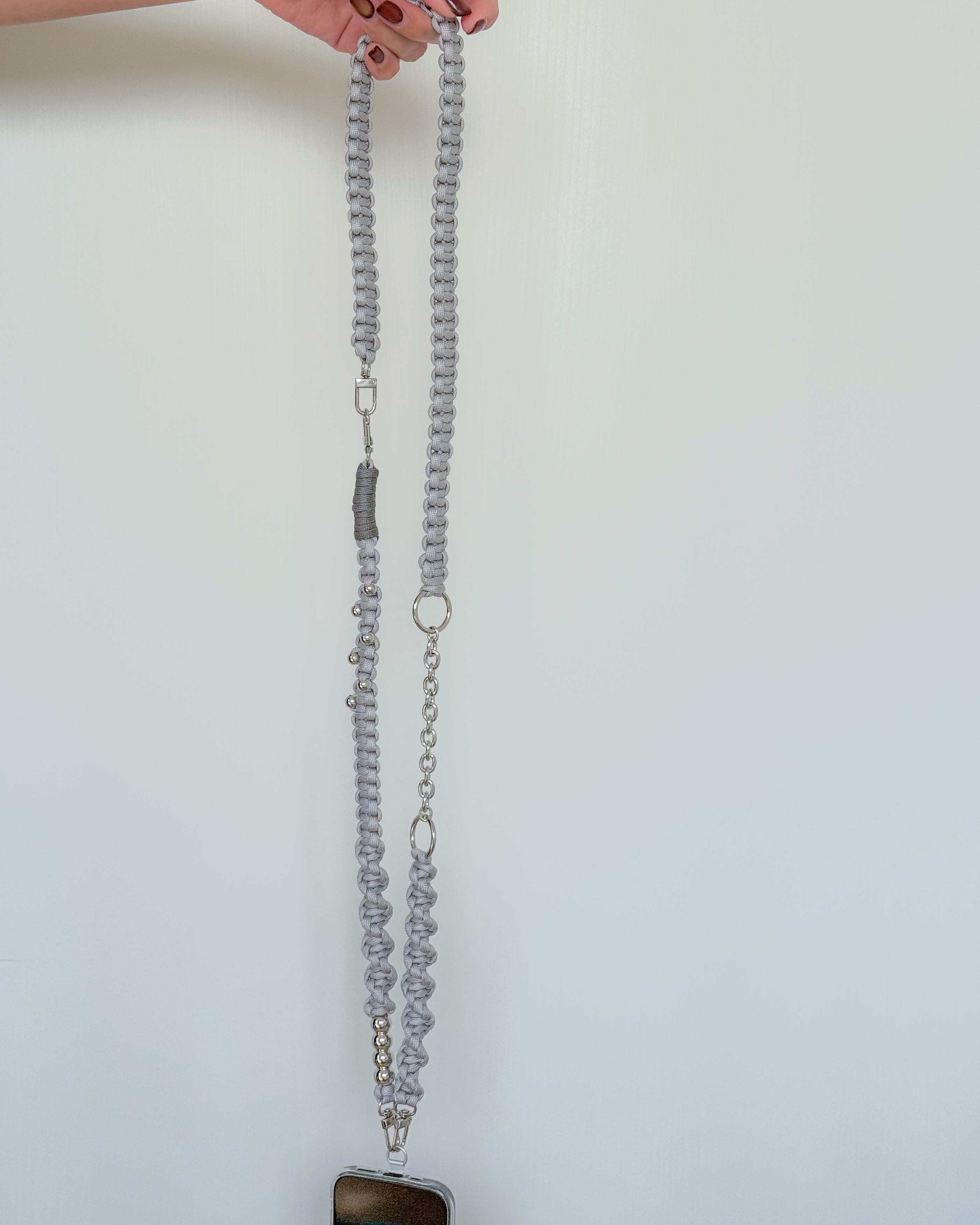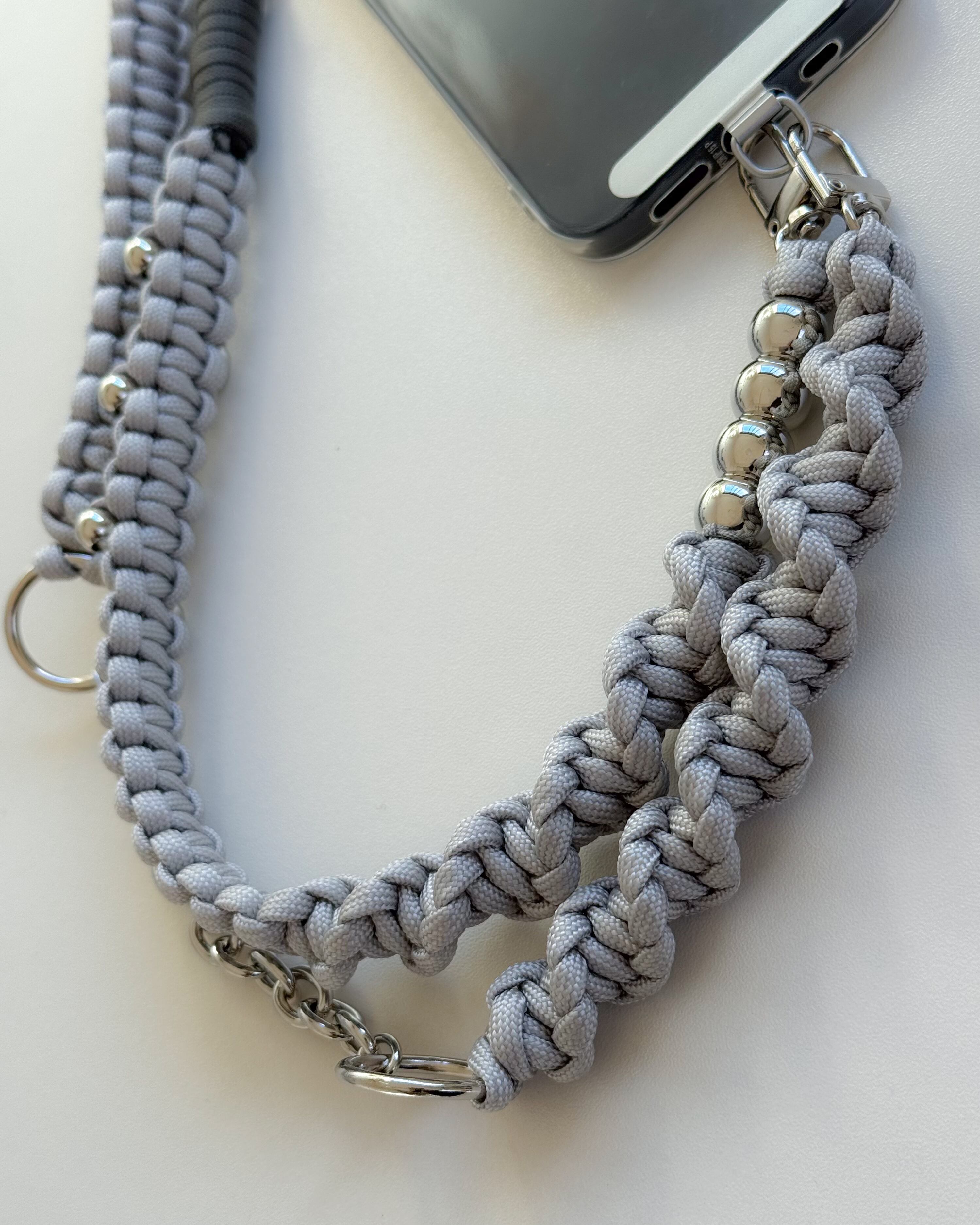 パラコードのミニマルな編み地に、シルバーパーツとチェーンをアクセントとして組み合わせ、ストラップでありながらアクセサリーのように楽しめるデザインに。