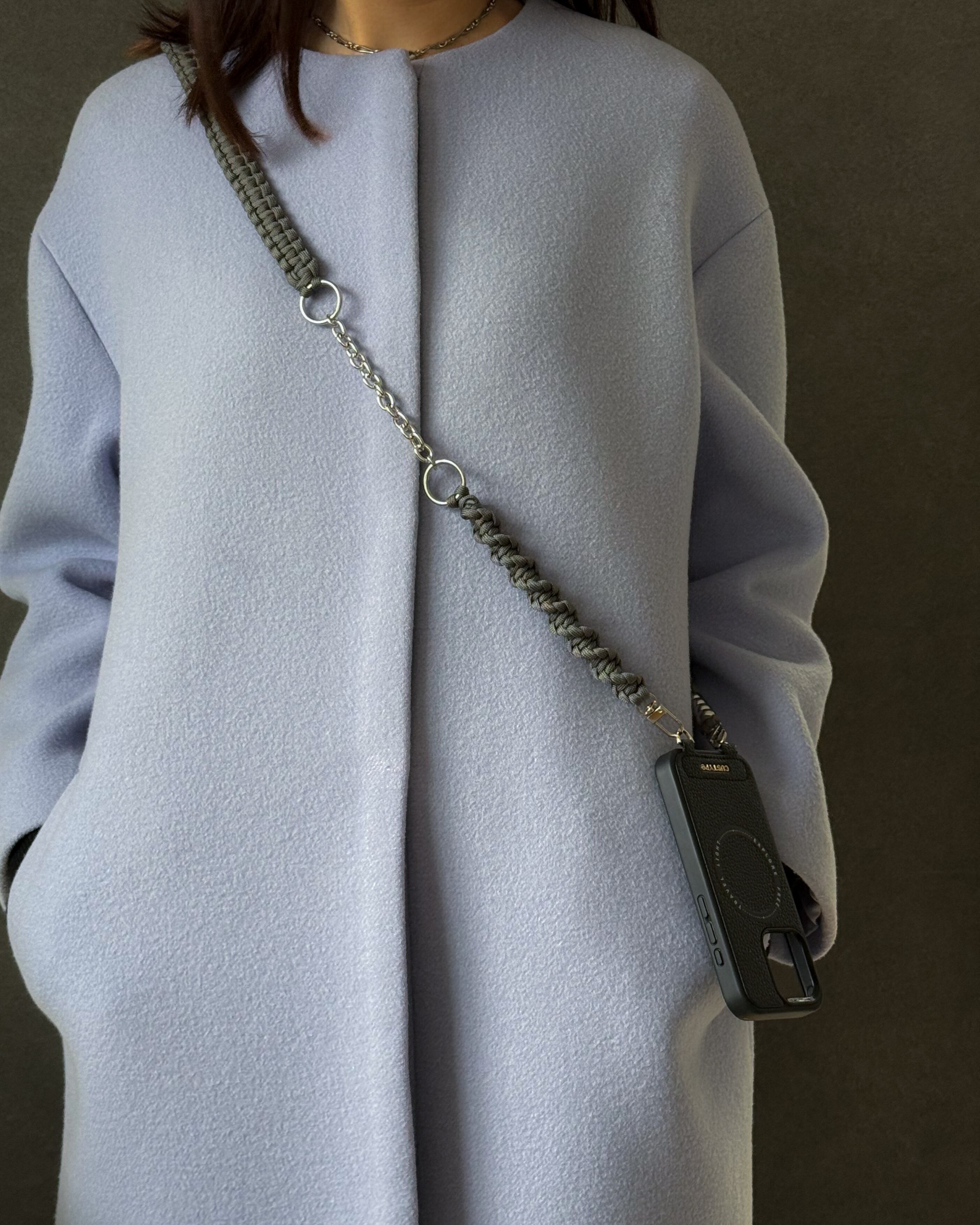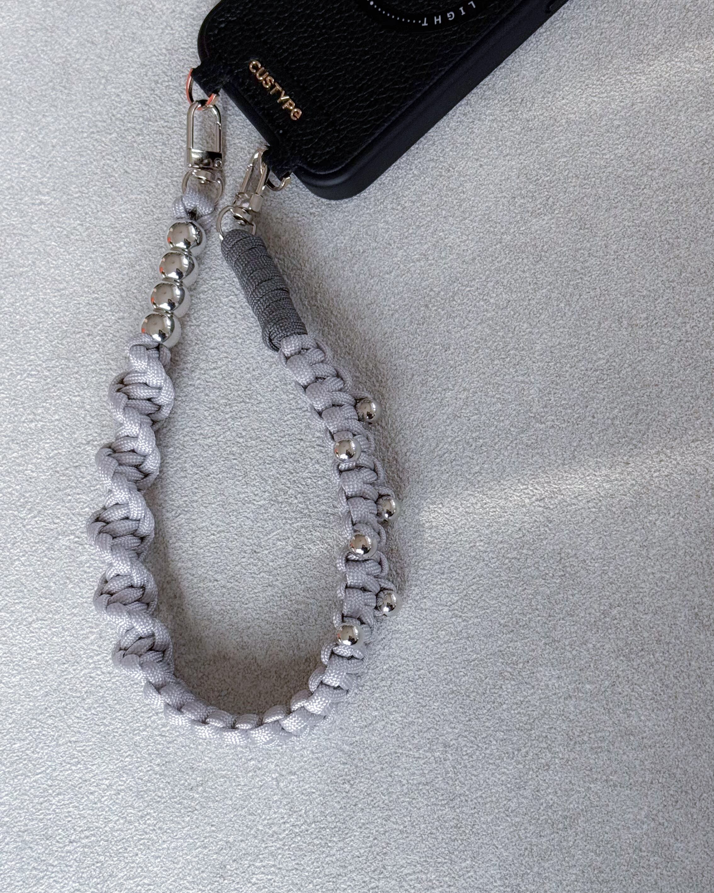 パラコードのミニマルな編み地に、シルバーパーツとチェーンをアクセントとして組み合わせ、ストラップでありながらアクセサリーのように楽しめるデザインに。