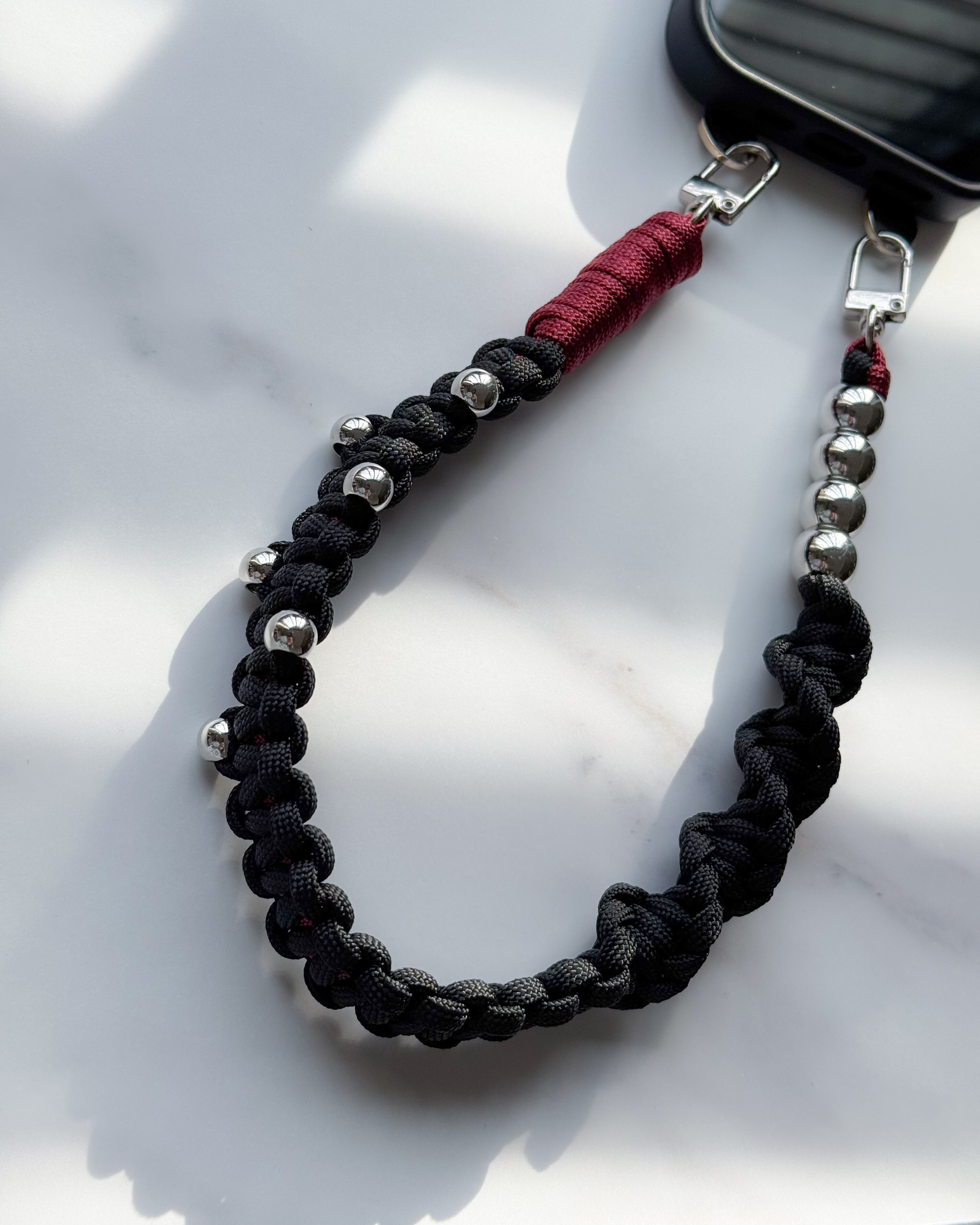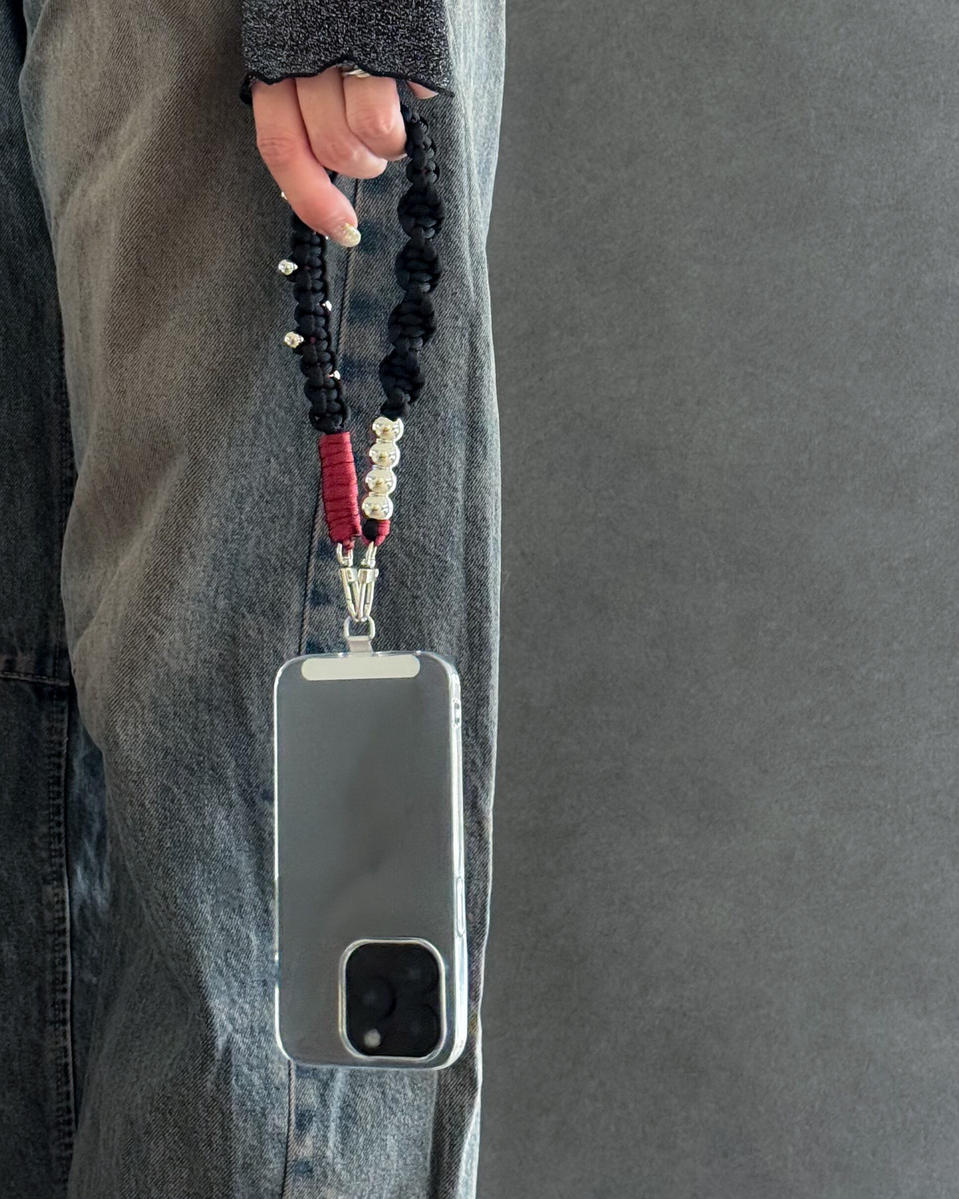 大小のシルバービーズがアクセントになり、ストラップでありながらアクセサリーのような存在感も。