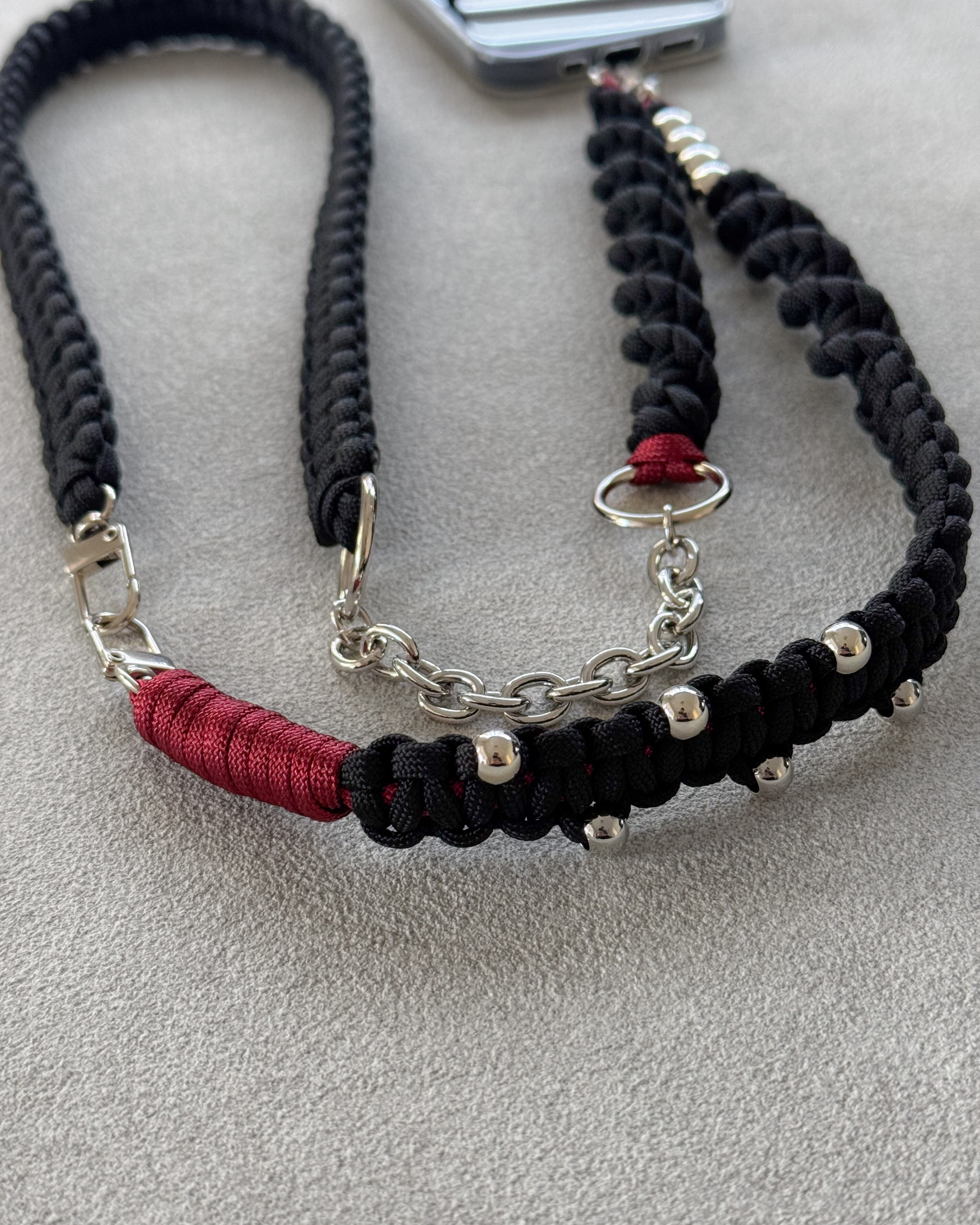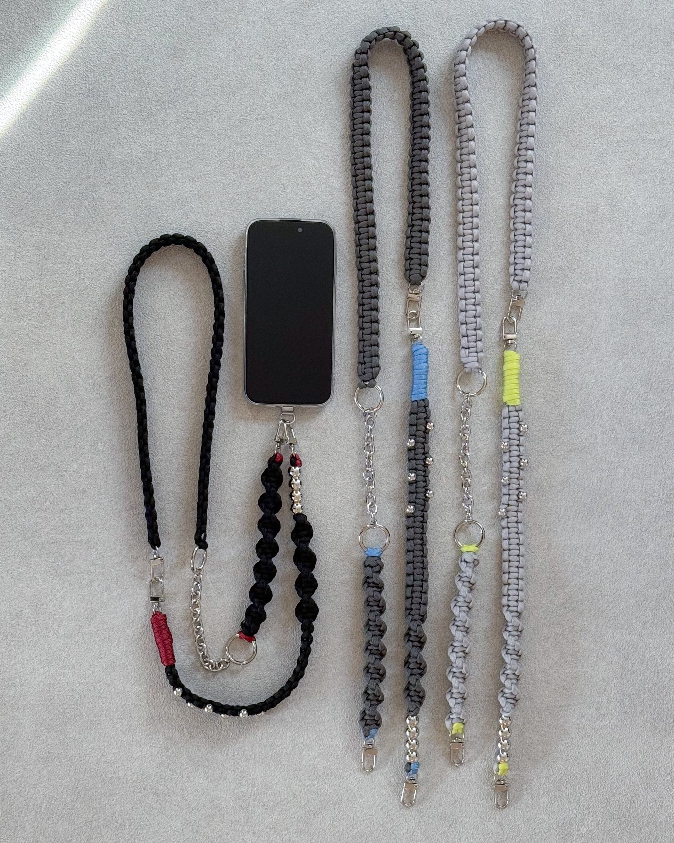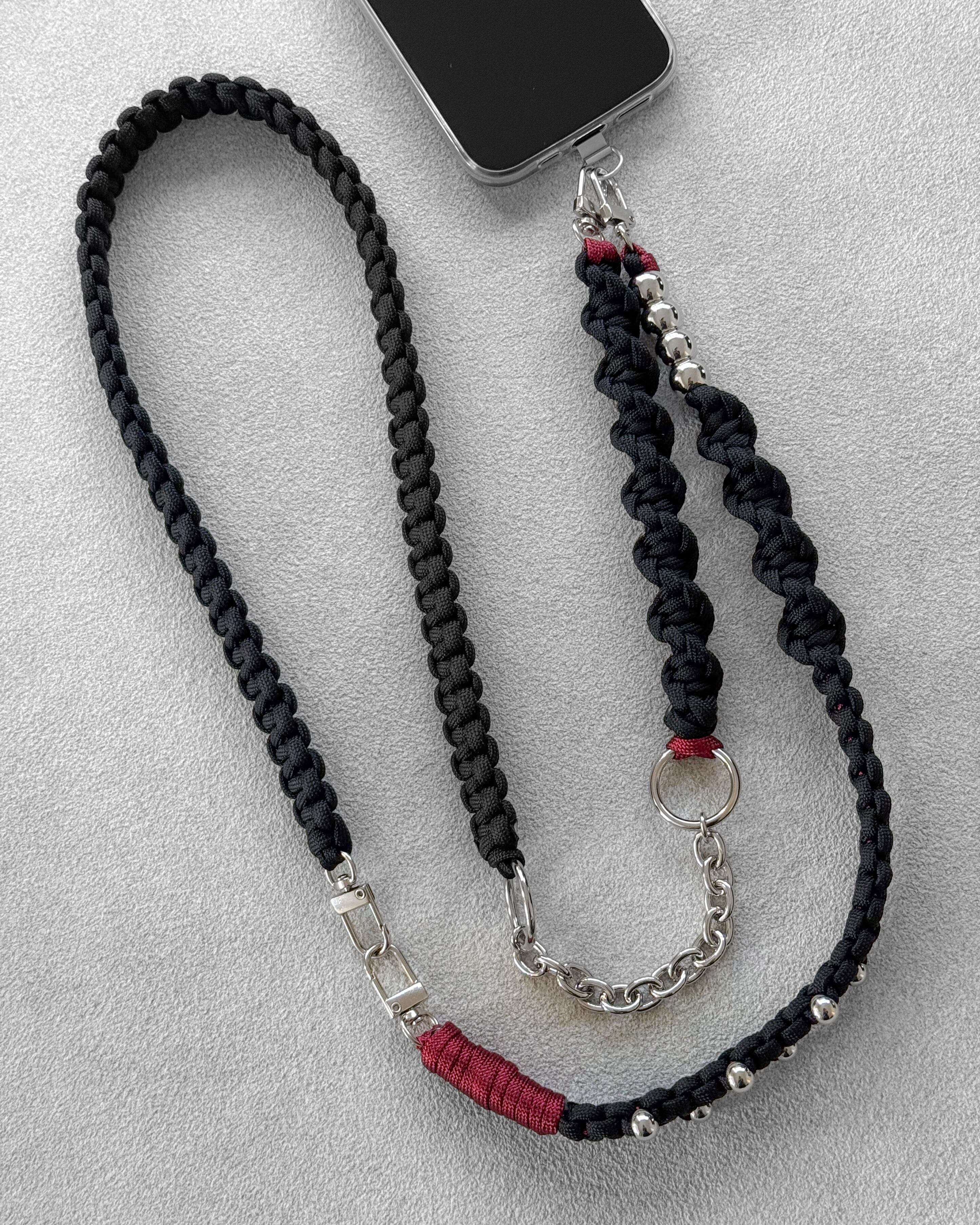 パラコードのミニマルな編み地に、シルバーパーツとチェーンをアクセントとして組み合わせ、ストラップでありながらアクセサリーのように楽しめるデザインに。