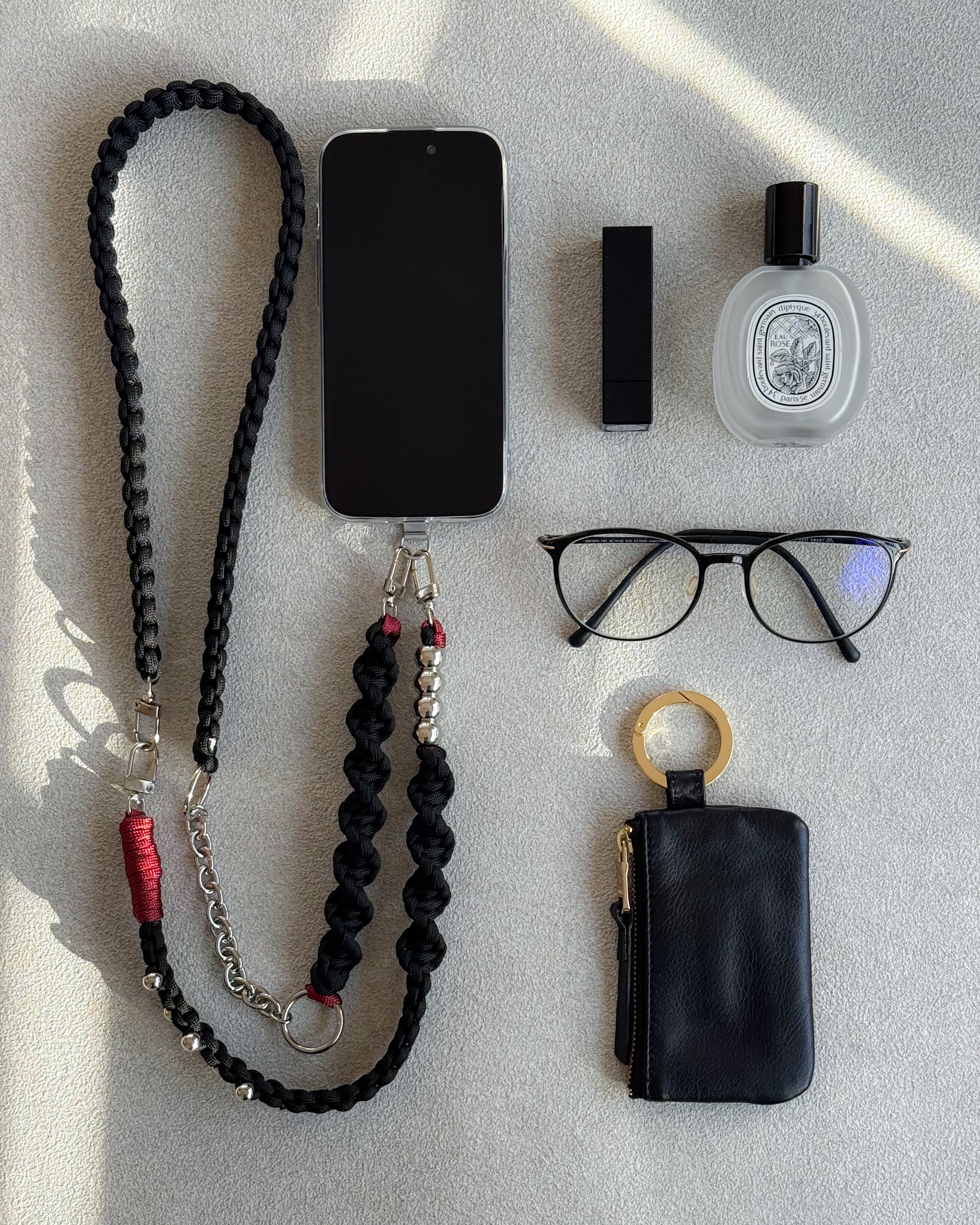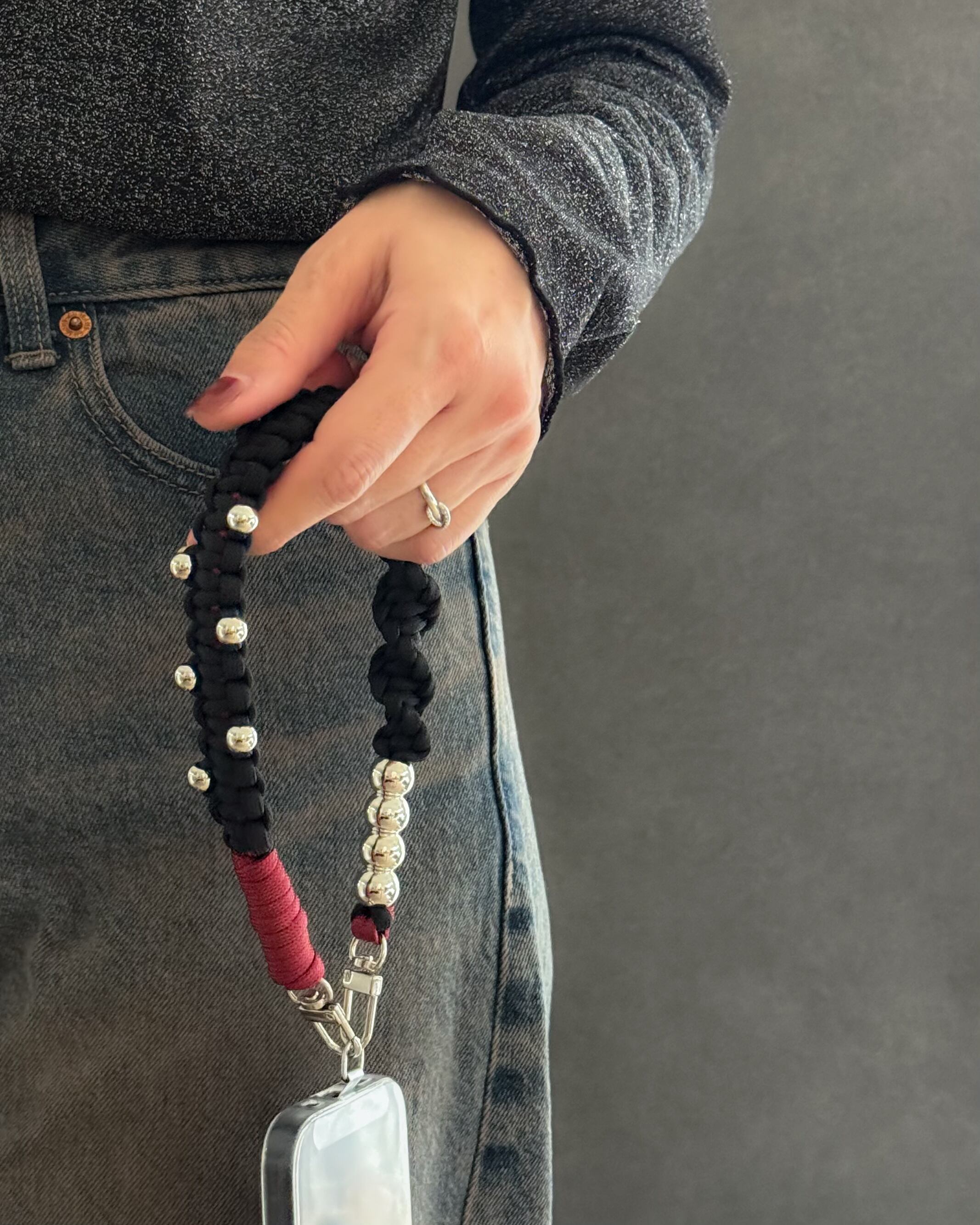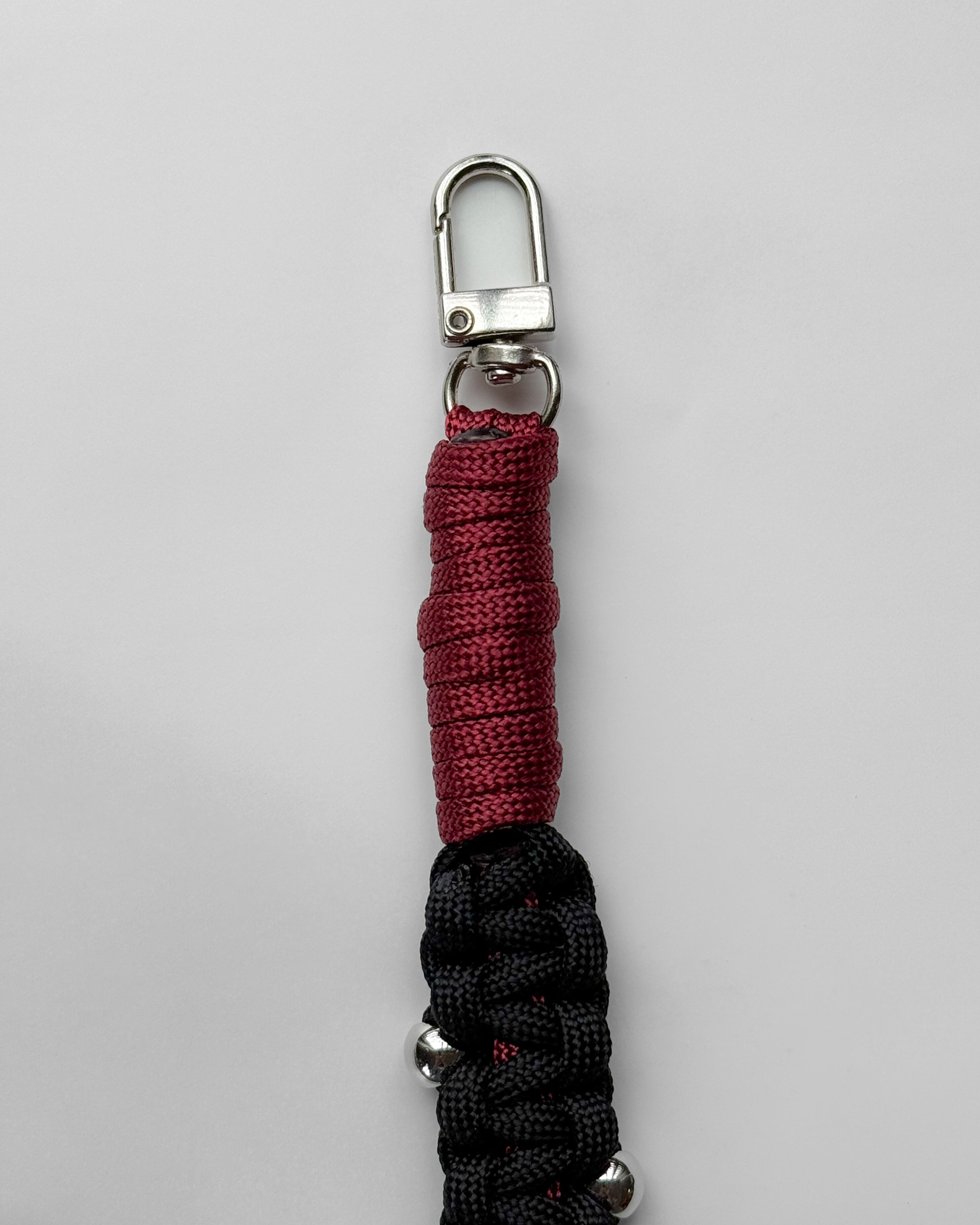 パラコードのミニマルな編み地に、シルバーパーツとチェーンをアクセントとして組み合わせ、ストラップでありながらアクセサリーのように楽しめるデザインに。