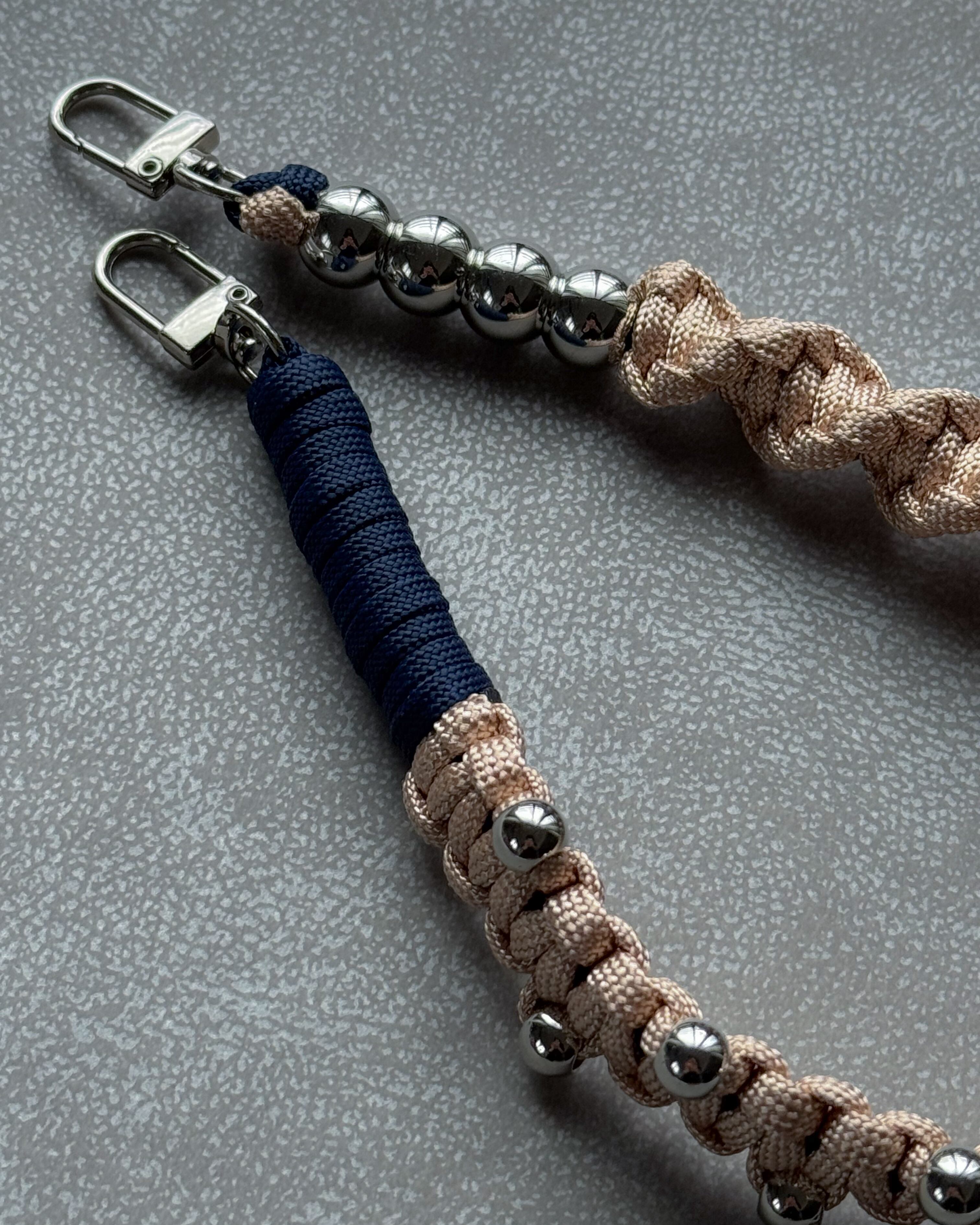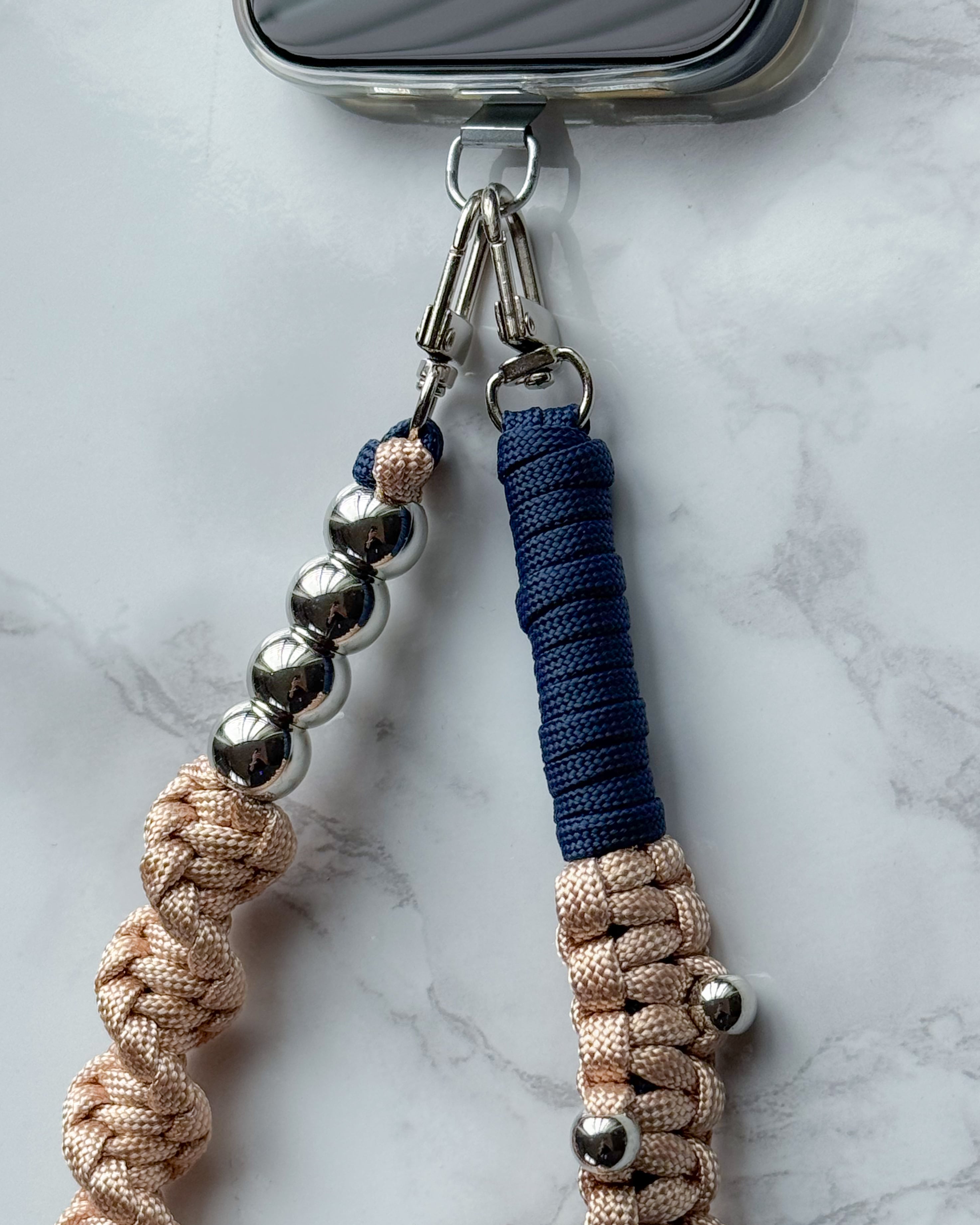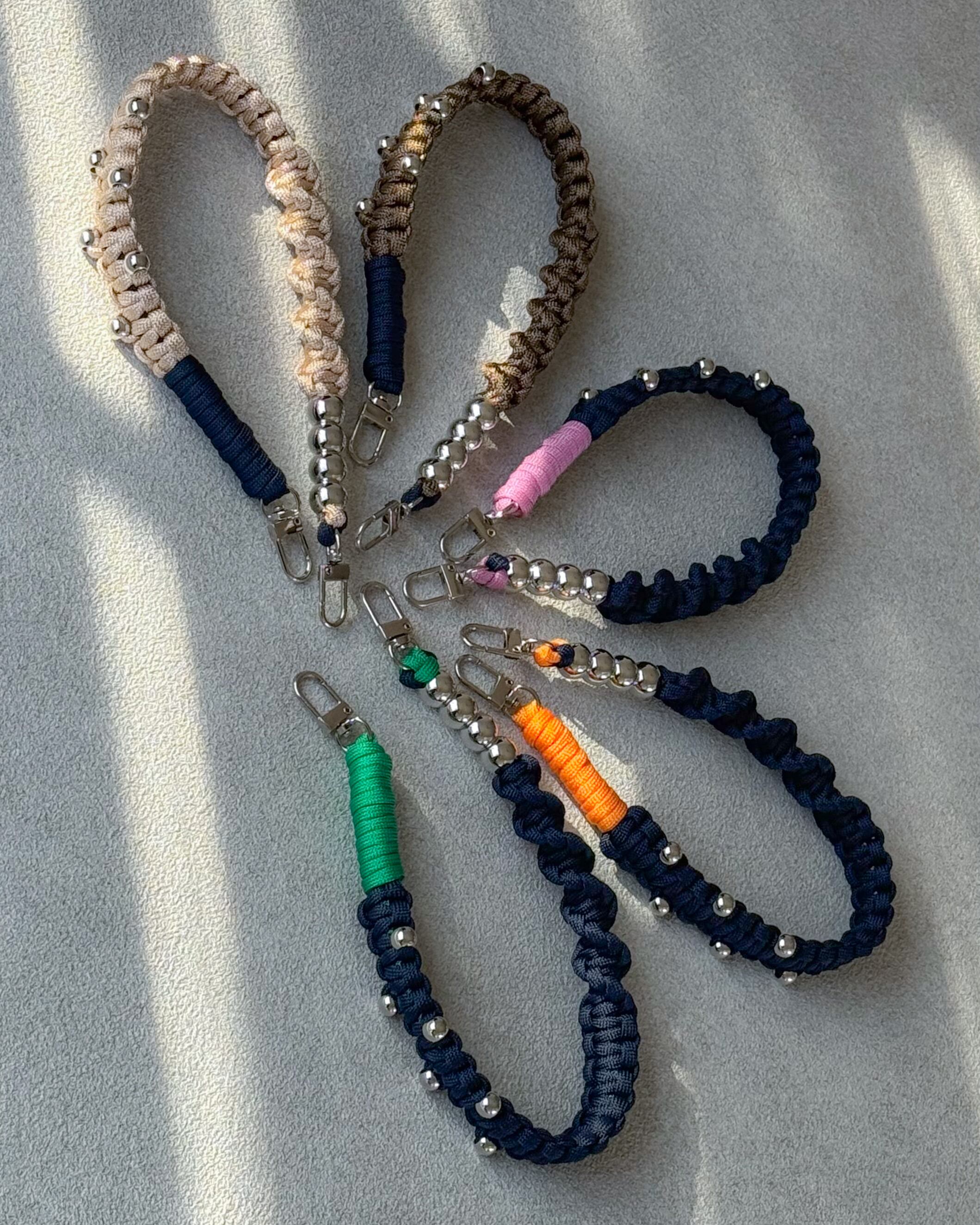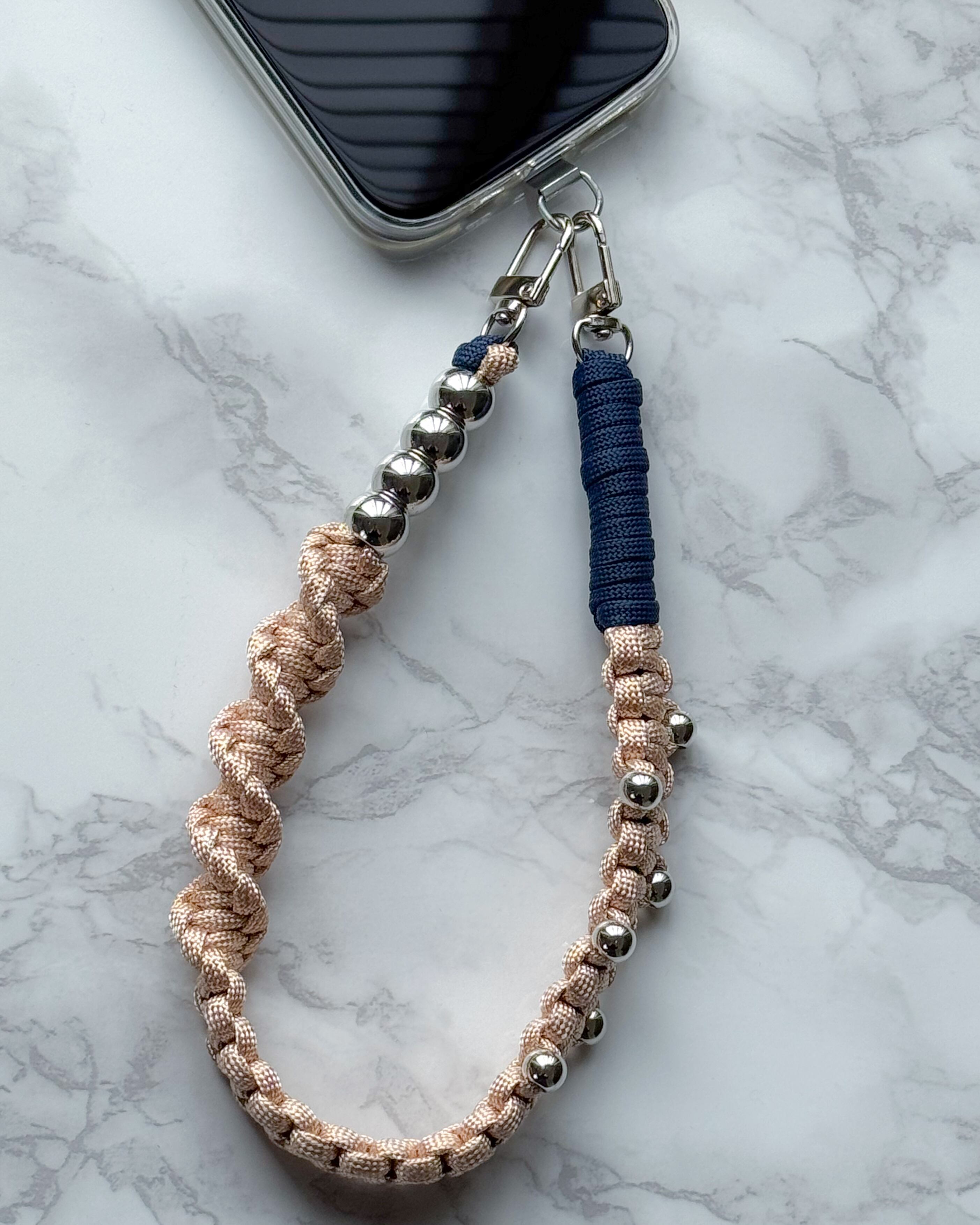 大小のシルバービーズがアクセントになり、ストラップでありながらアクセサリーのような存在感も。