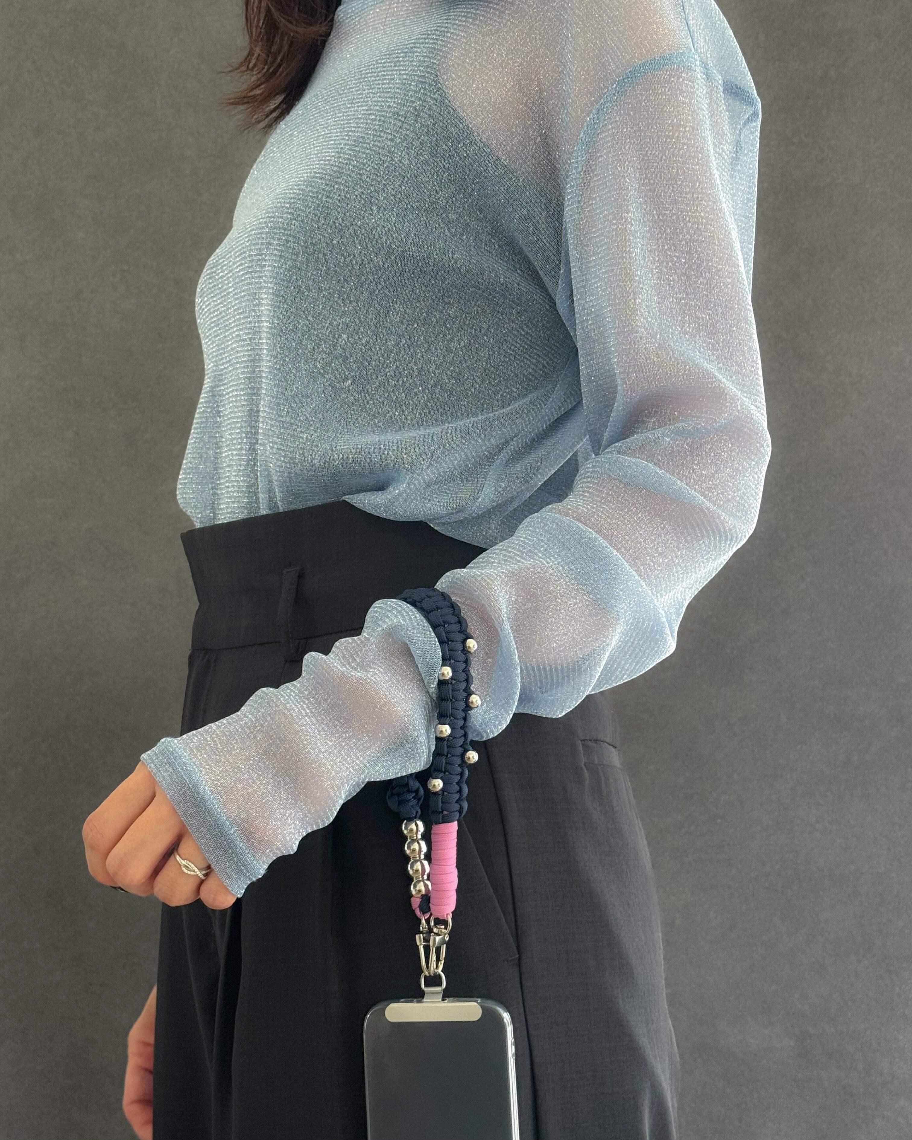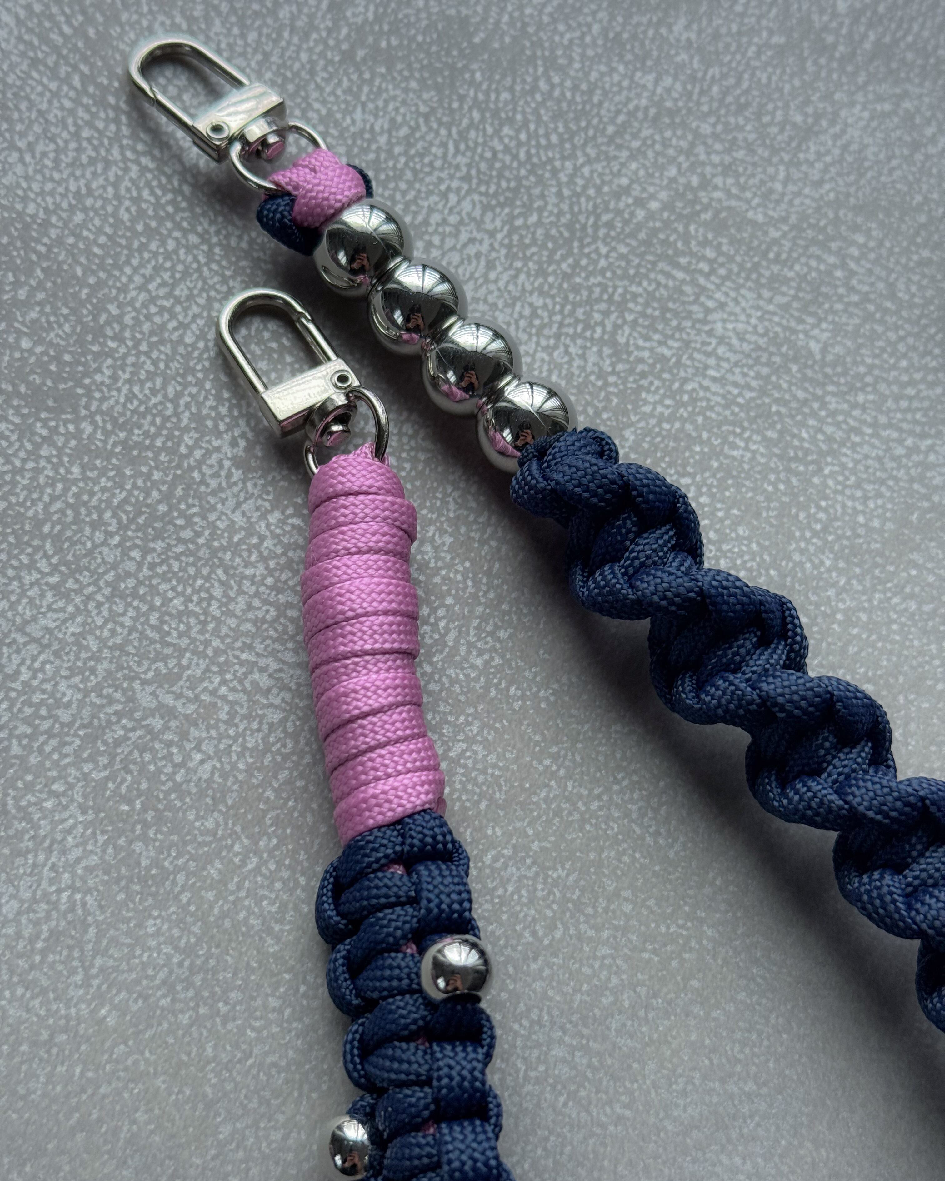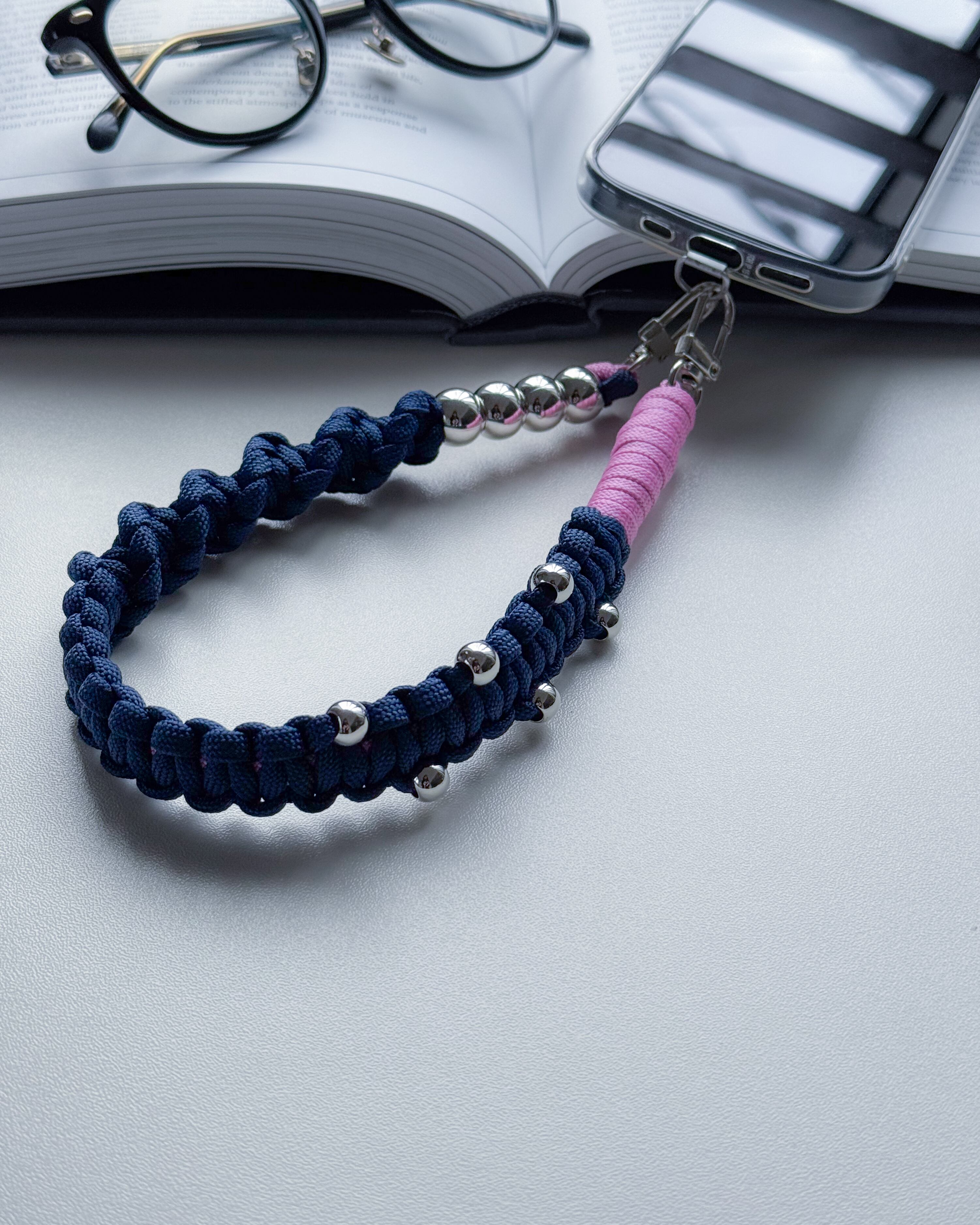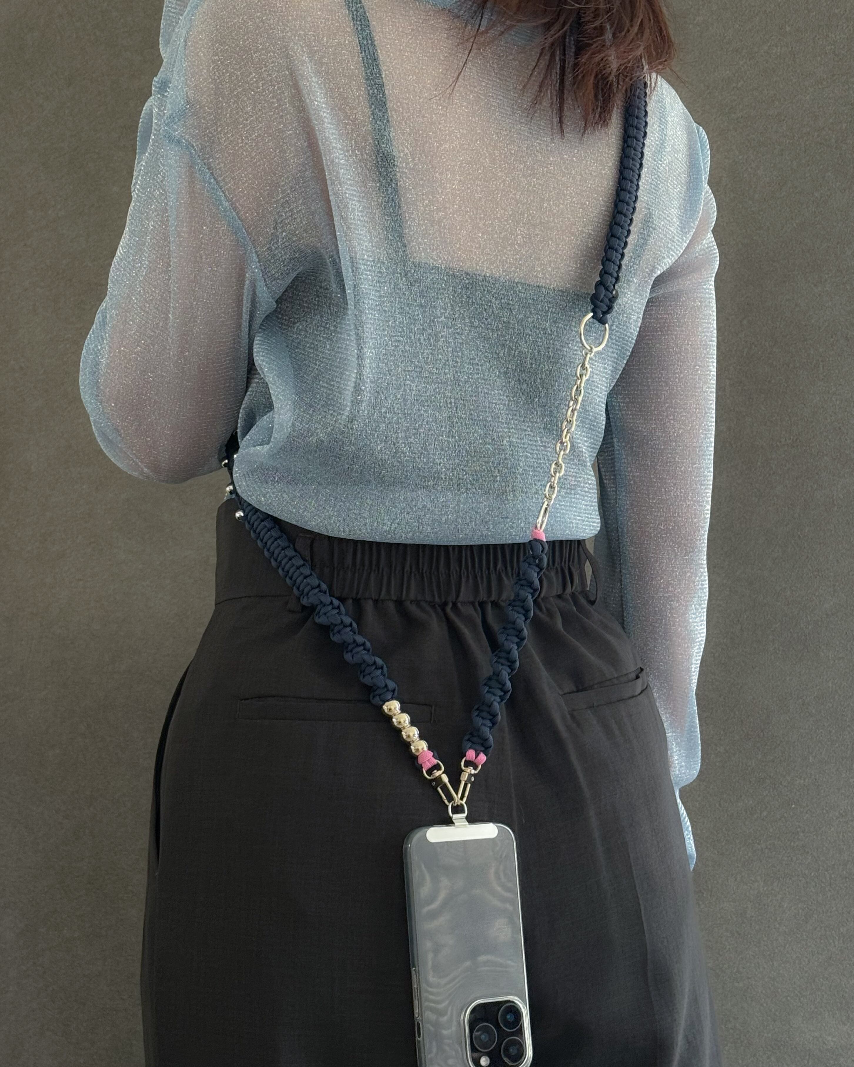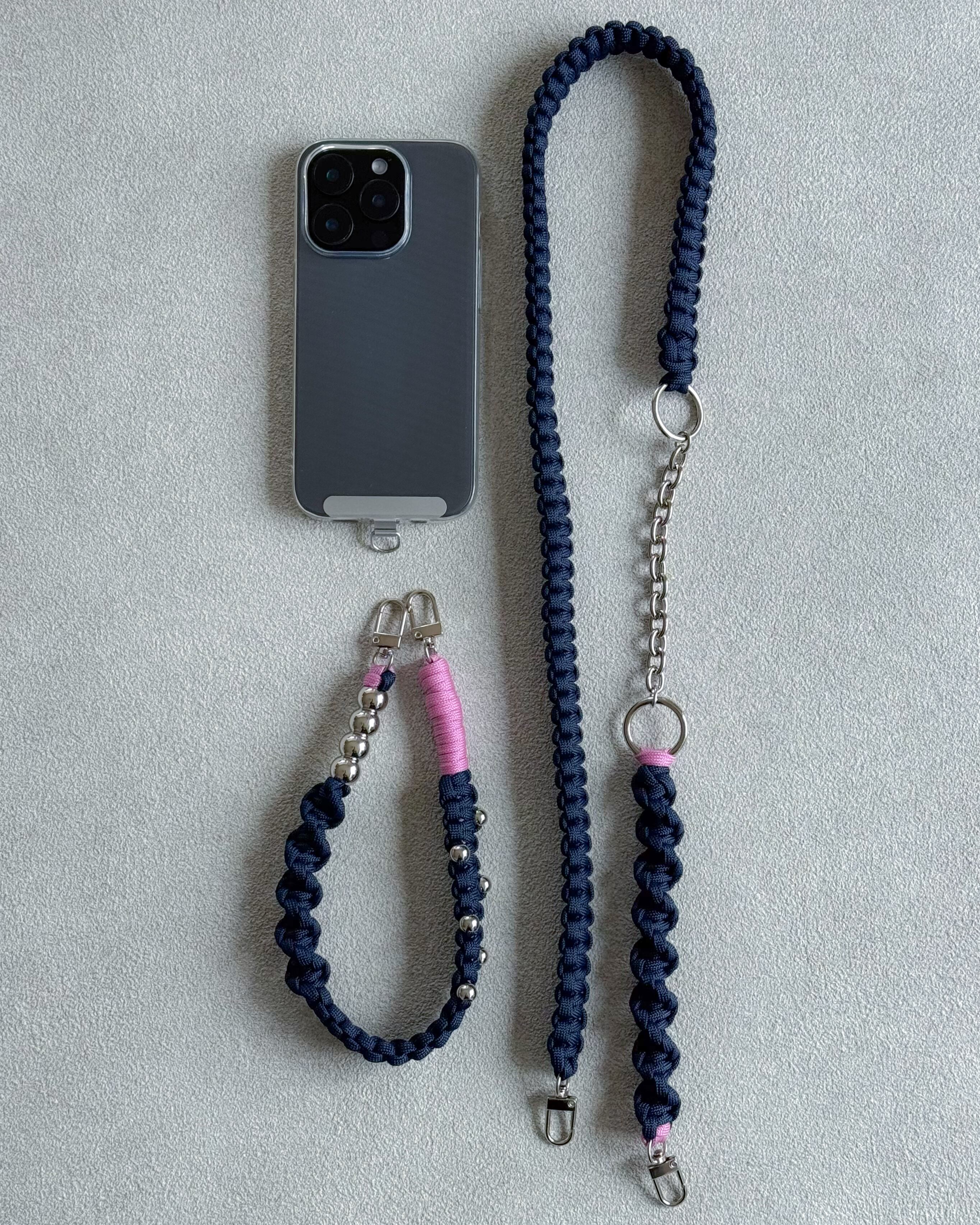 パラコードのミニマルな編み地に、シルバーパーツとチェーンをアクセントとして組み合わせ、ストラップでありながらアクセサリーのように楽しめるデザインに。