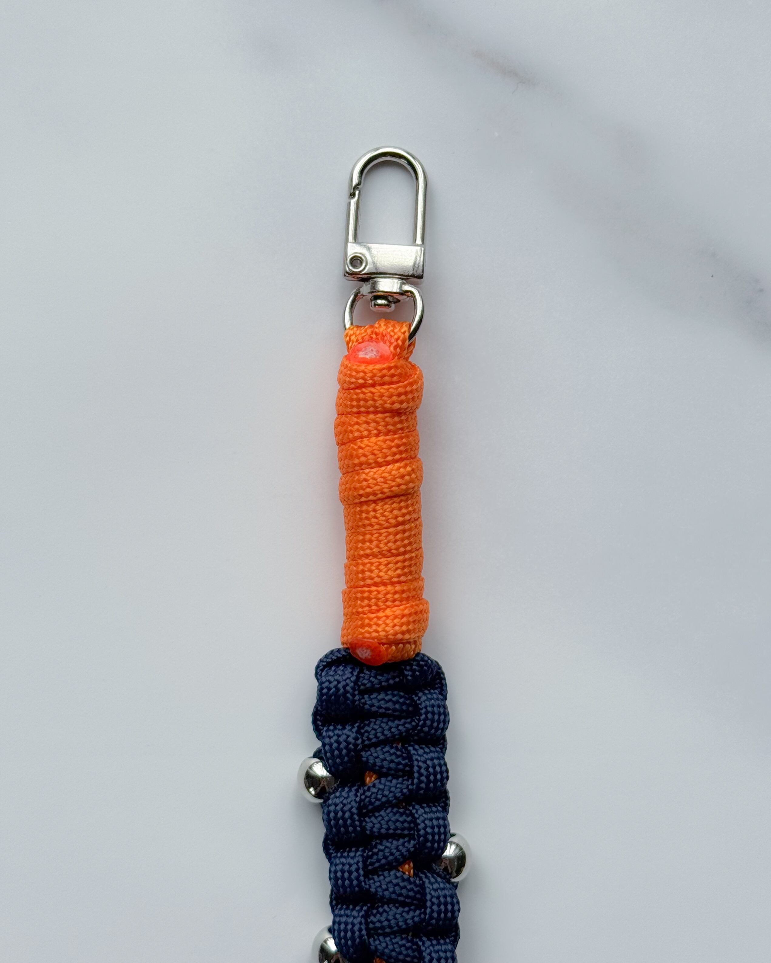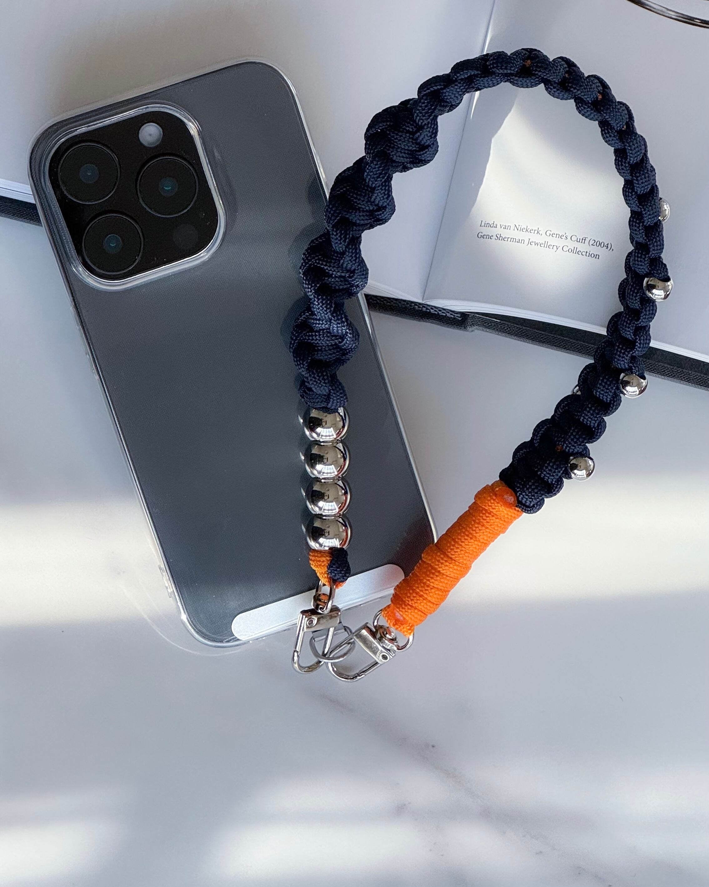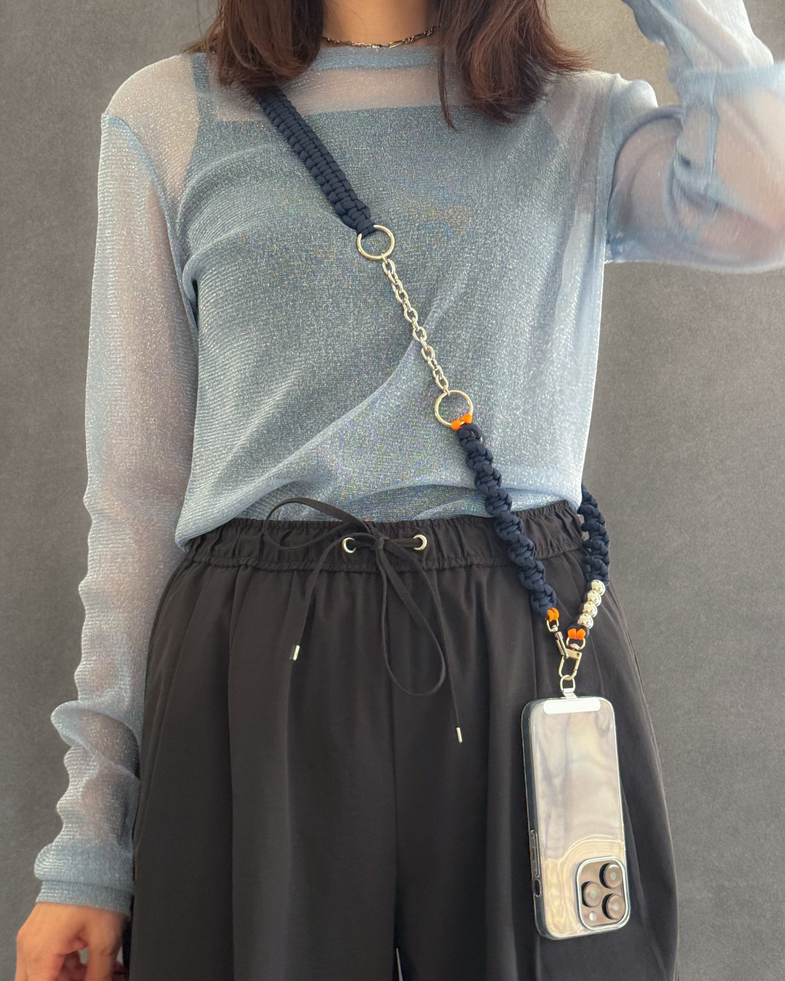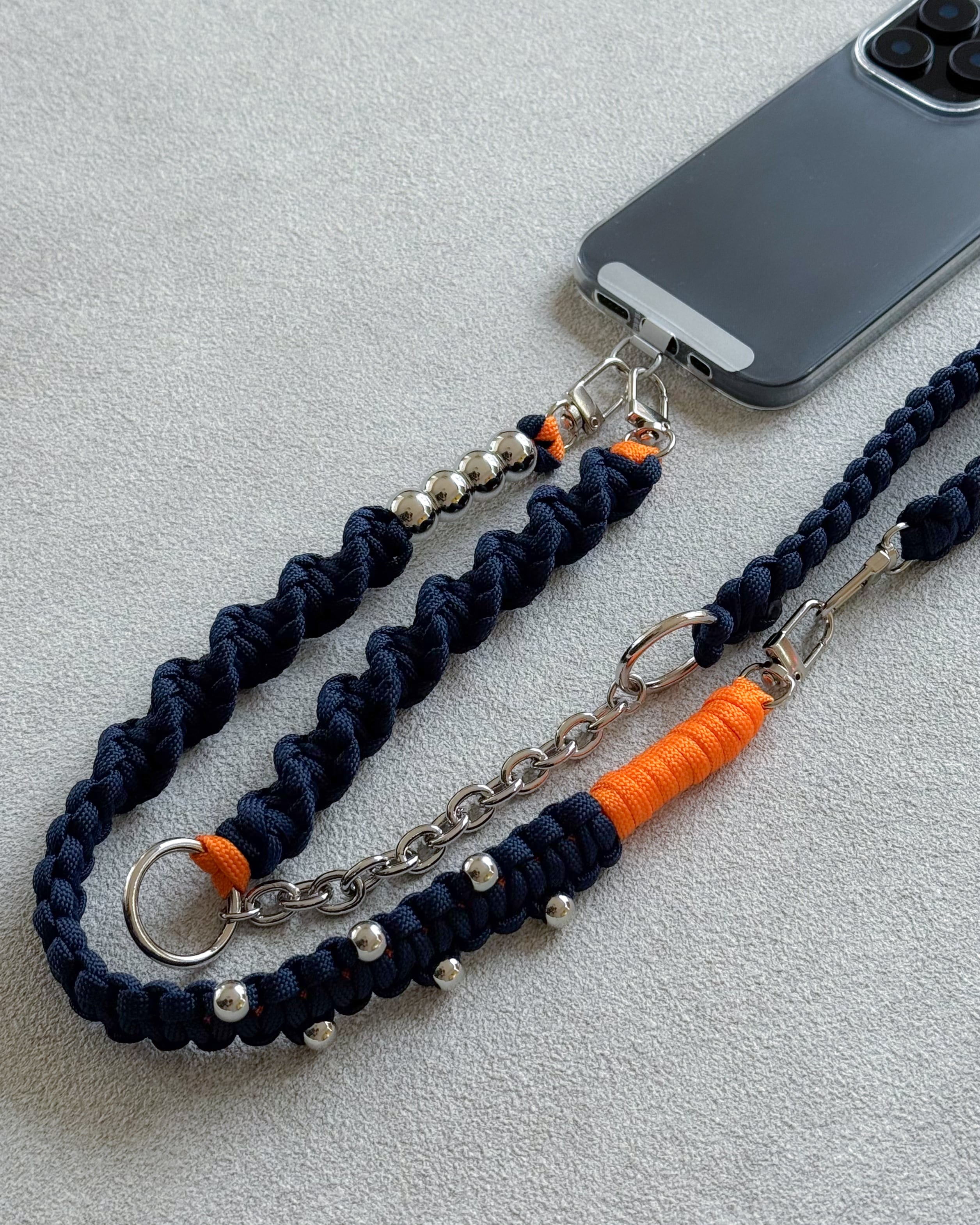 パラコードのミニマルな編み地に、シルバーパーツとチェーンをアクセントとして組み合わせ、ストラップでありながらアクセサリーのように楽しめるデザインに。