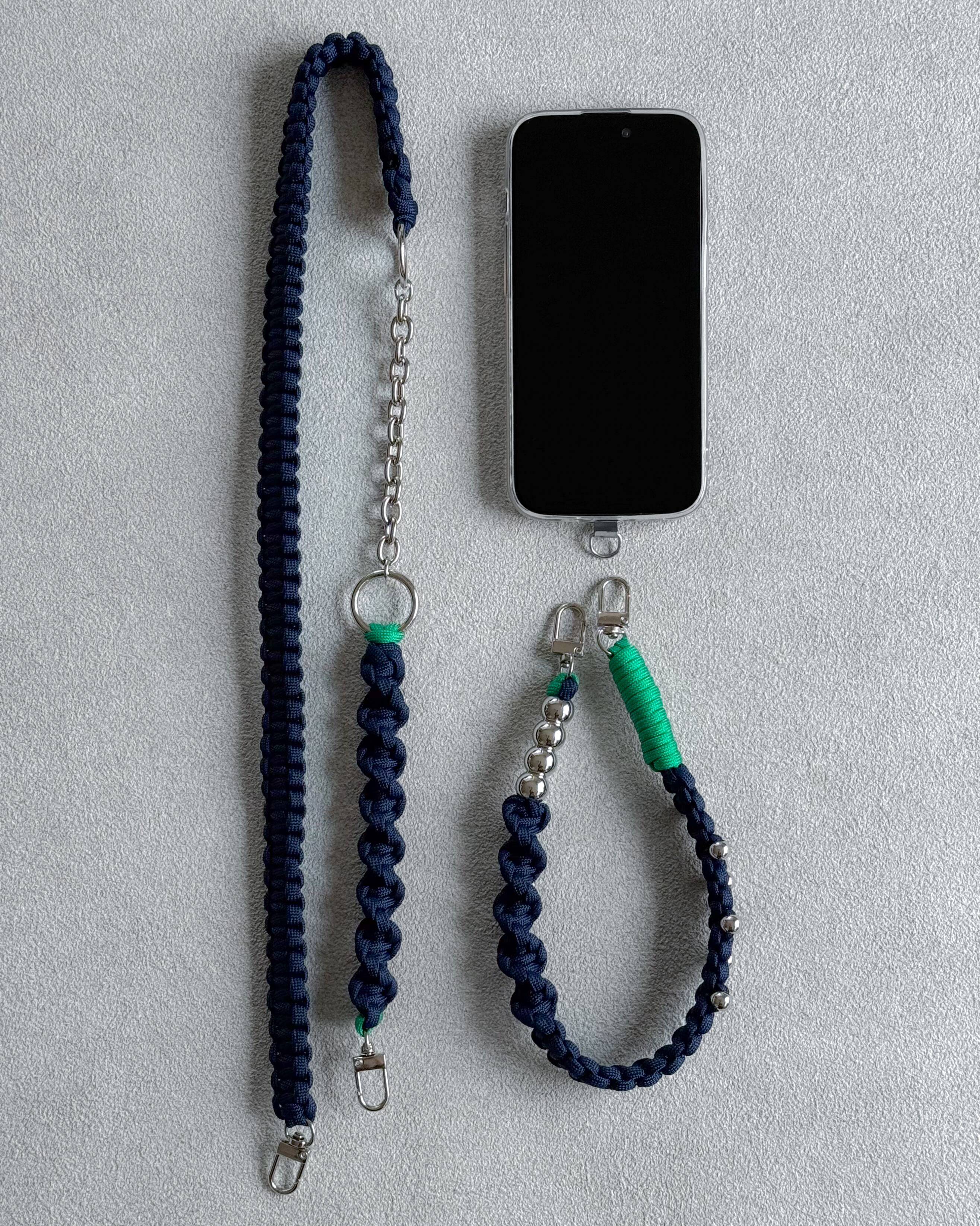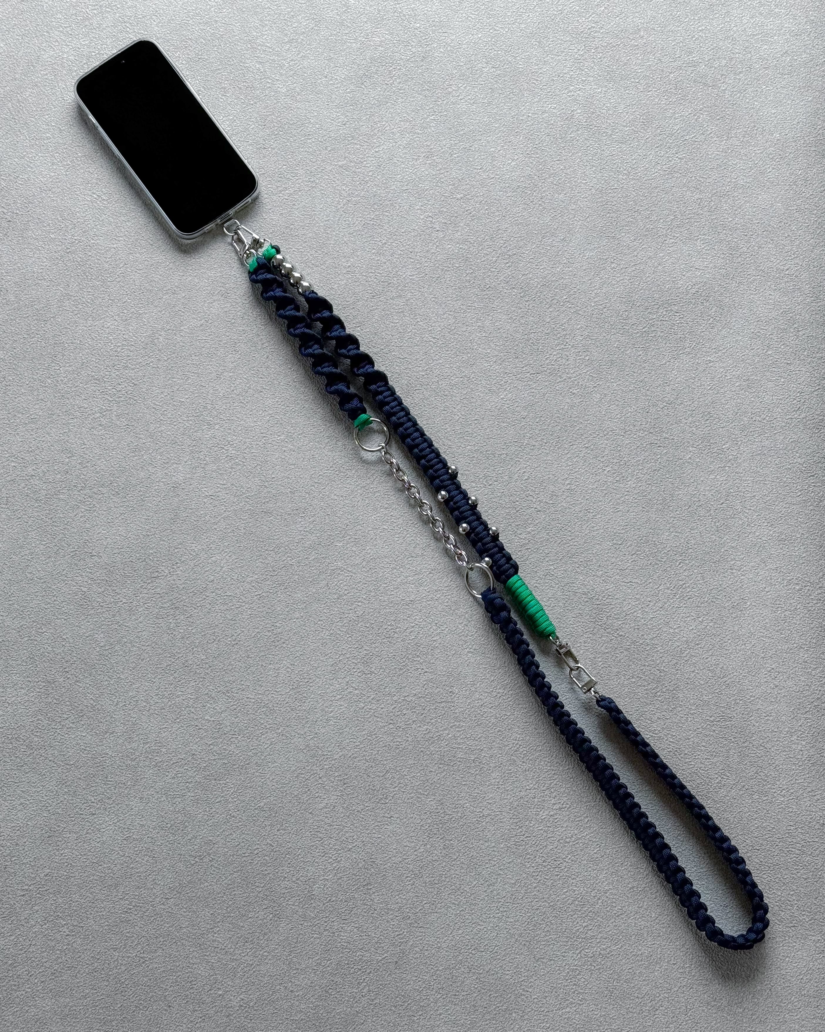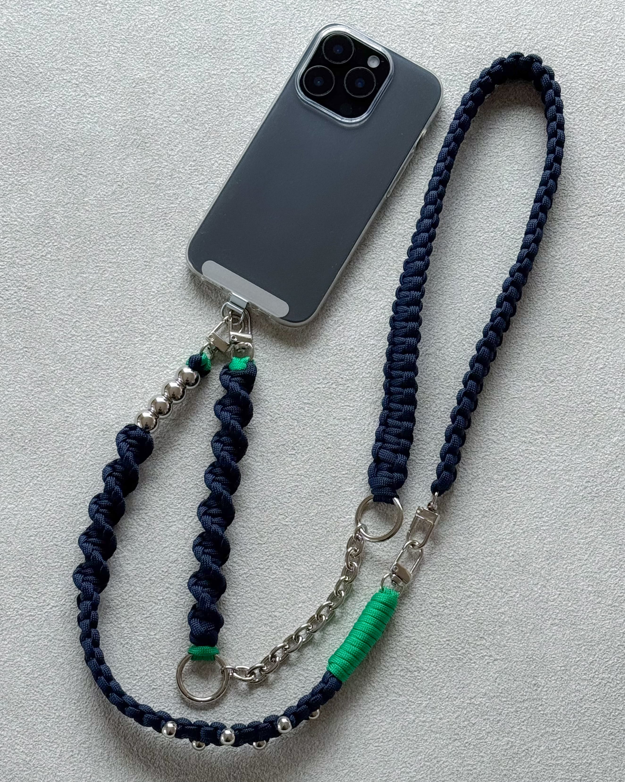 パラコードのミニマルな編み地に、シルバーパーツとチェーンをアクセントとして組み合わせ、ストラップでありながらアクセサリーのように楽しめるデザインに。