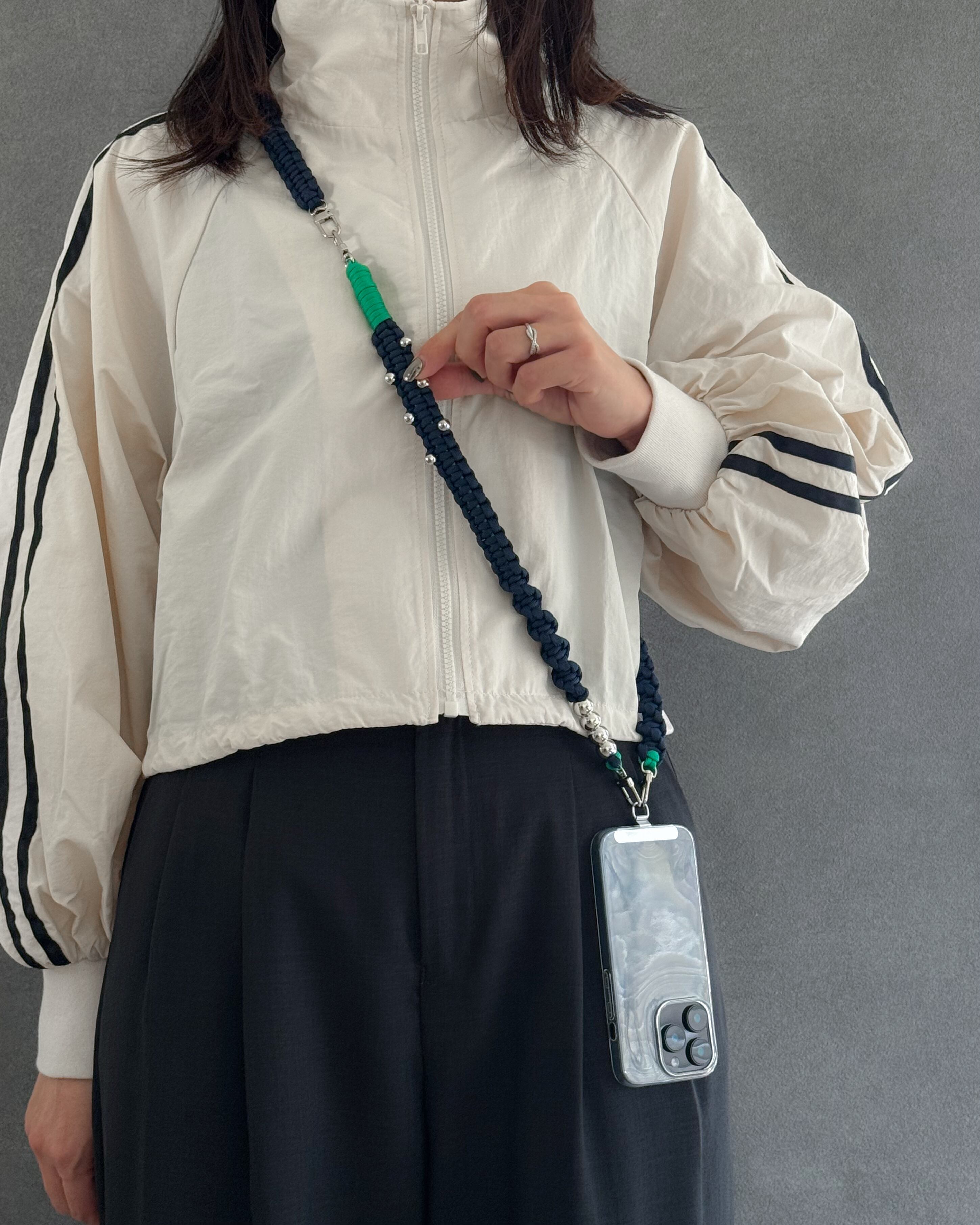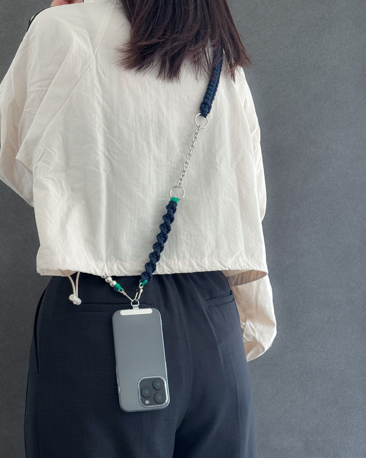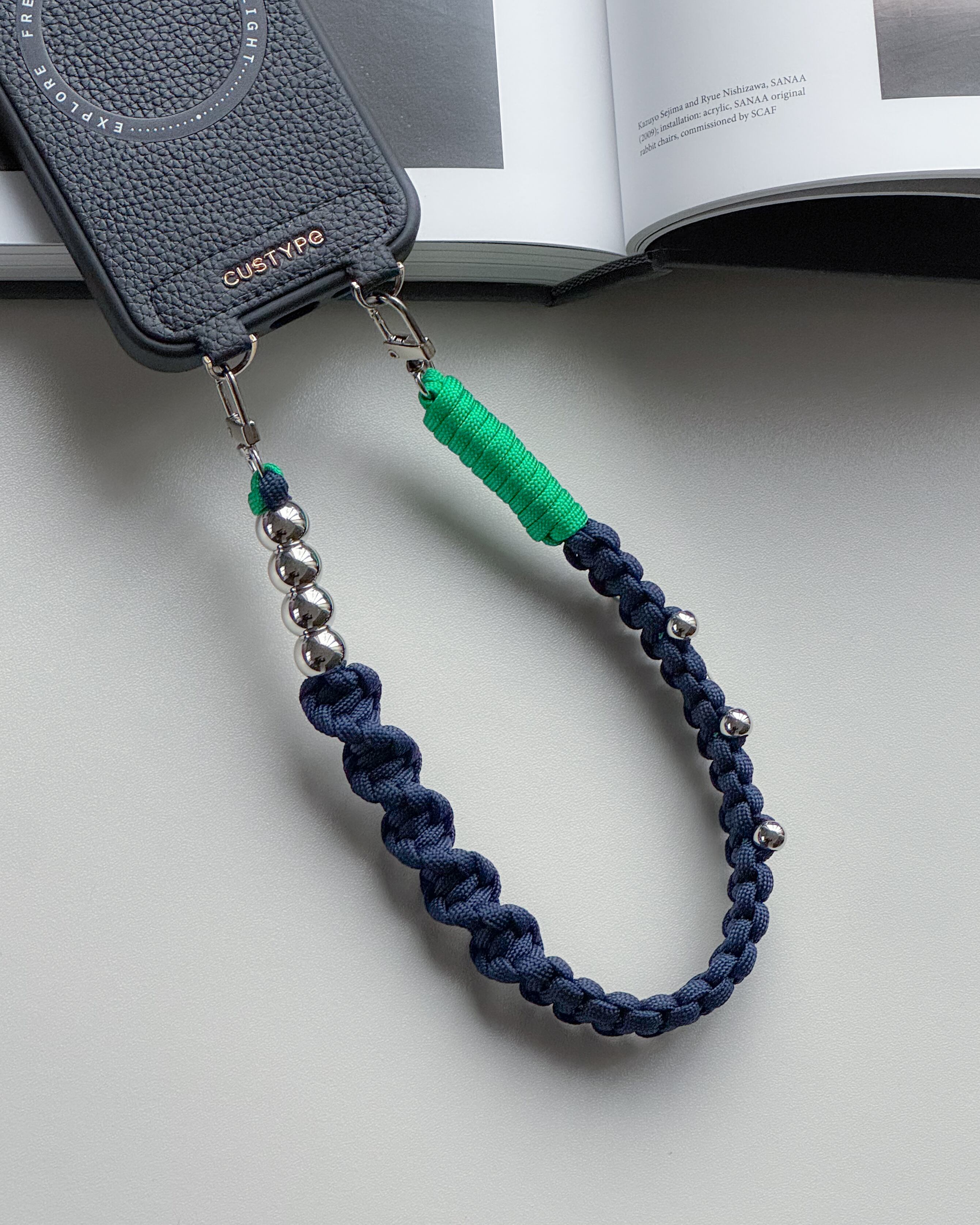 パラコードのミニマルな編み地に、シルバーパーツとチェーンをアクセントとして組み合わせ、ストラップでありながらアクセサリーのように楽しめるデザインに。
