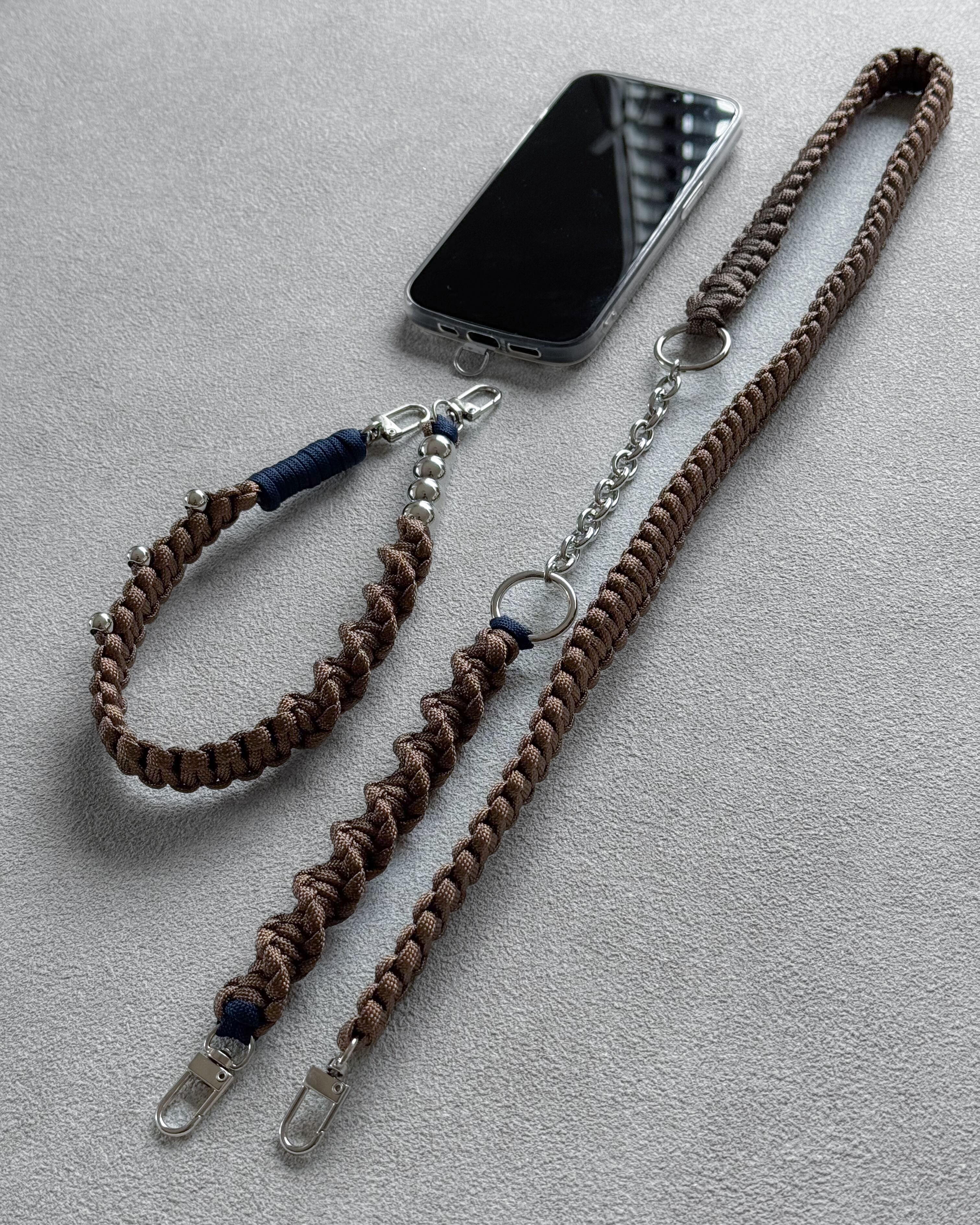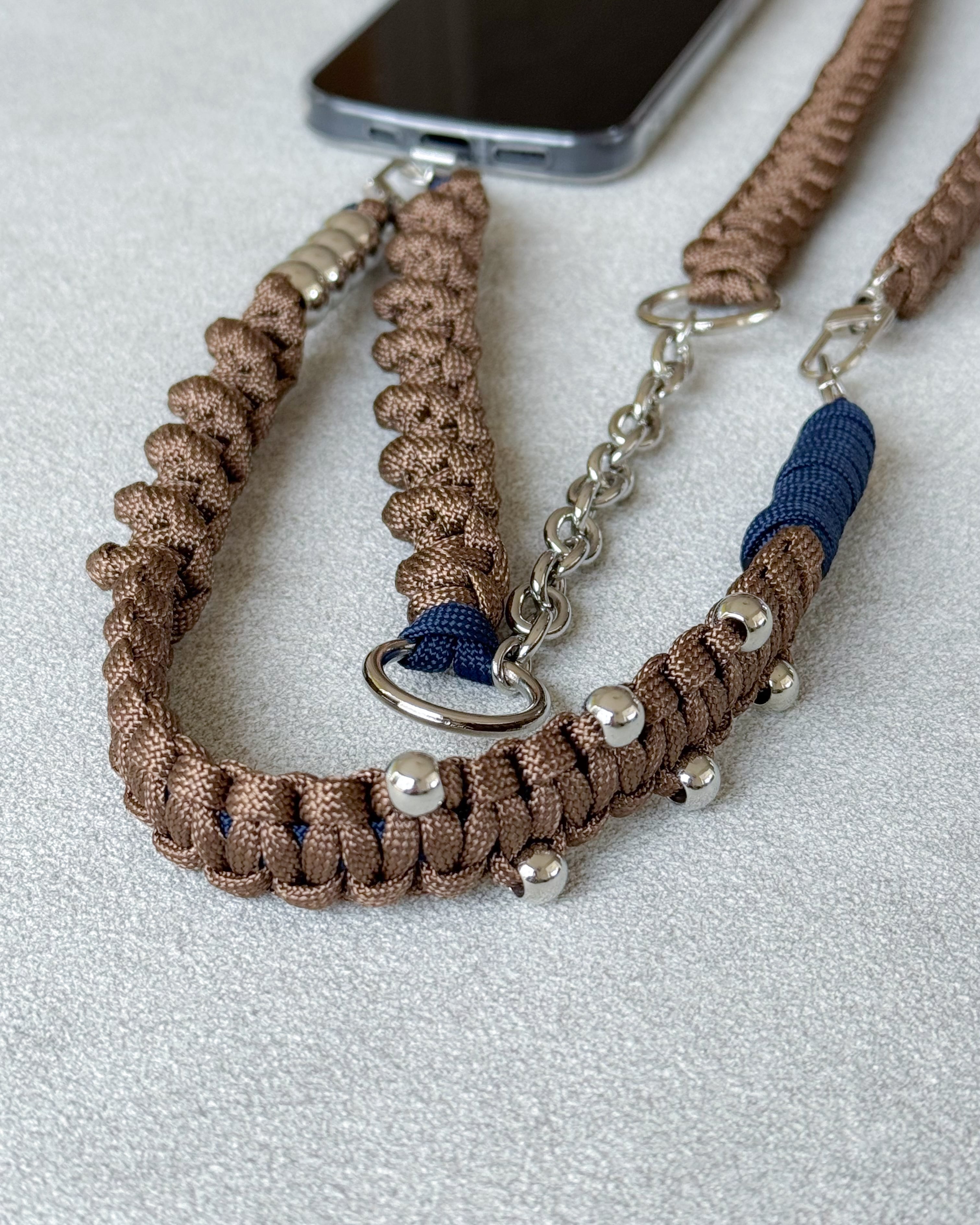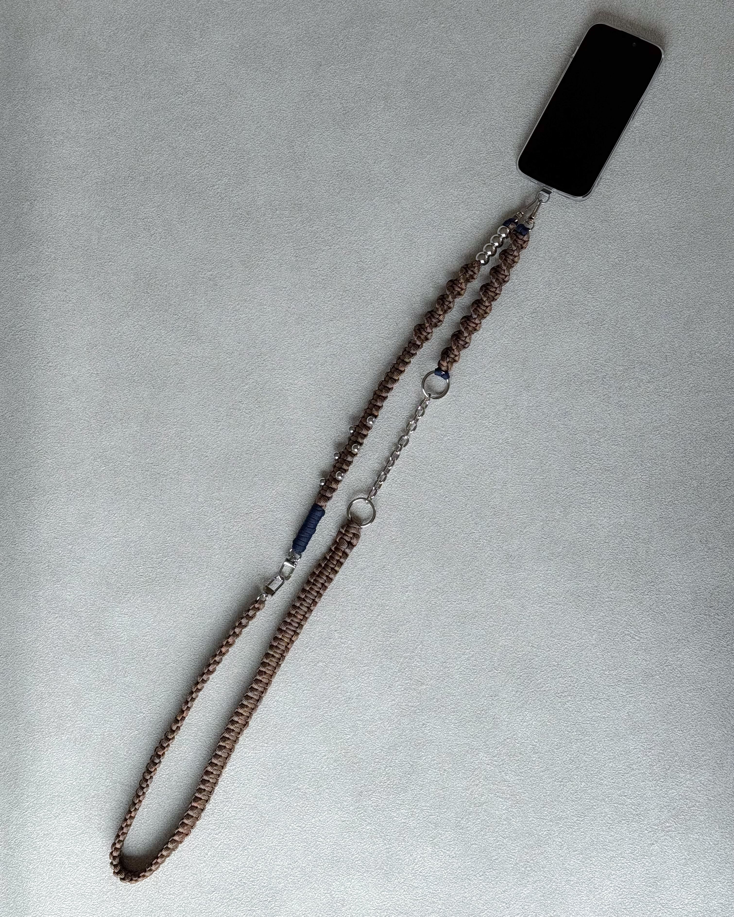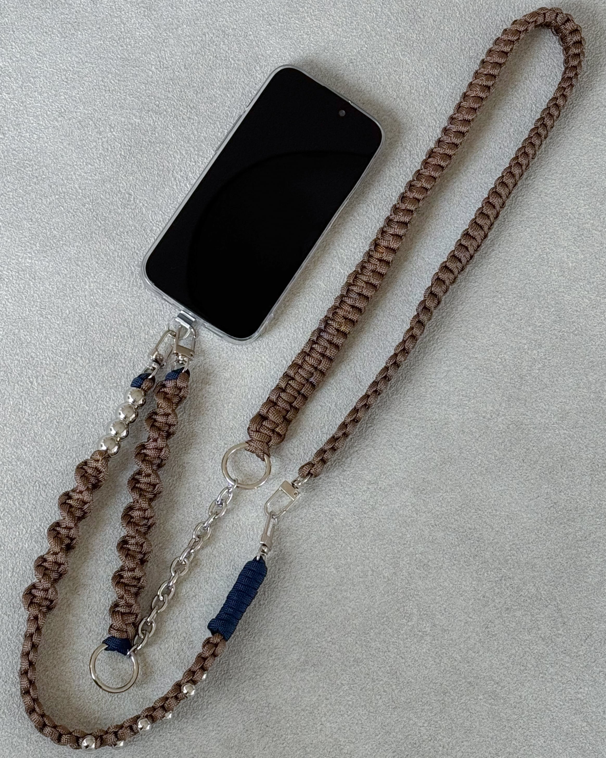 パラコードのミニマルな編み地に、シルバーパーツとチェーンをアクセントとして組み合わせ、ストラップでありながらアクセサリーのように楽しめるデザインに。