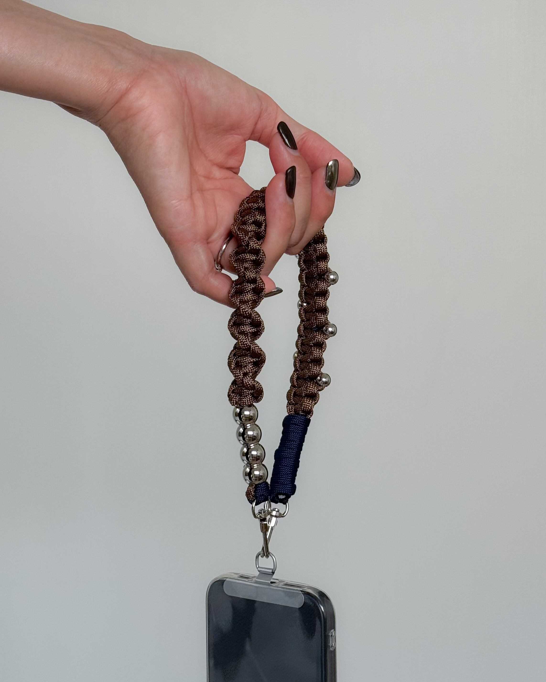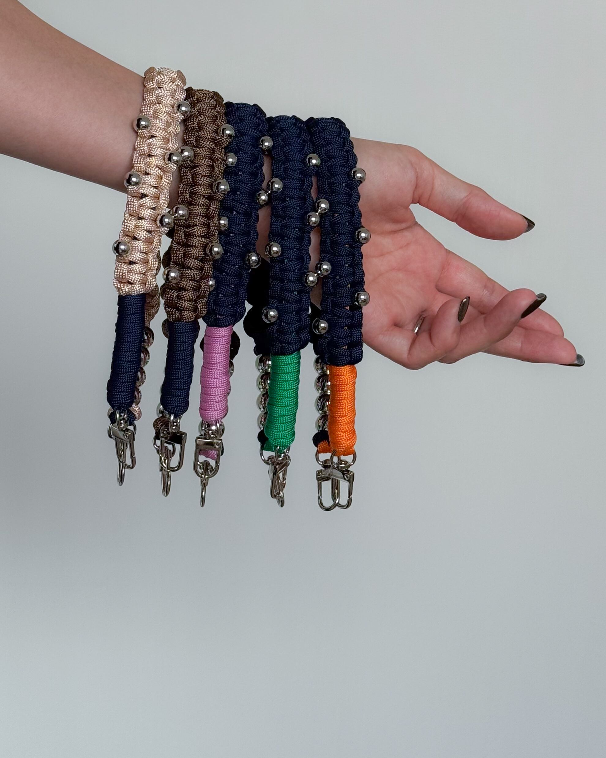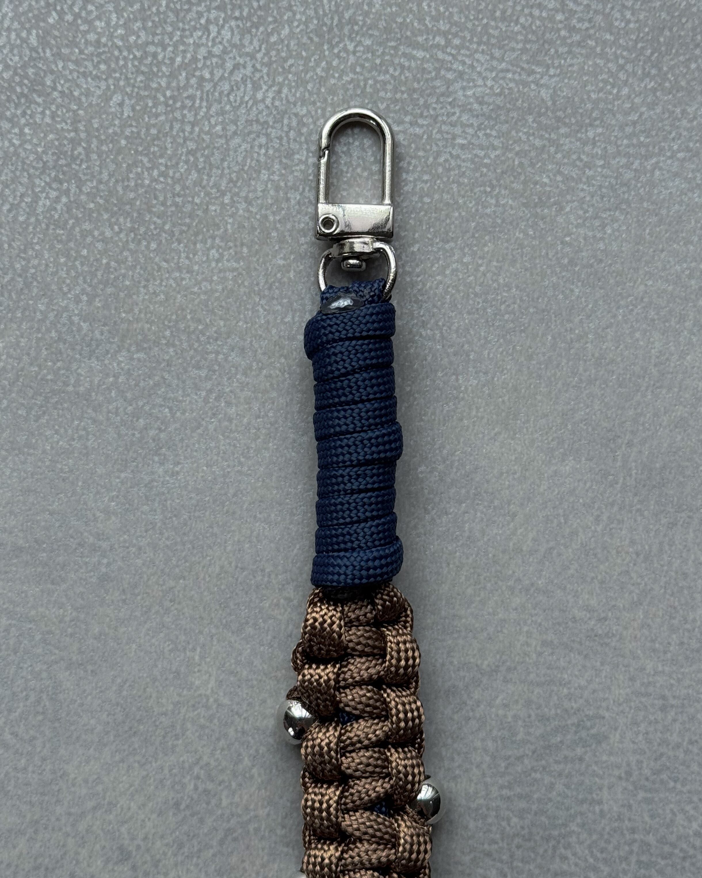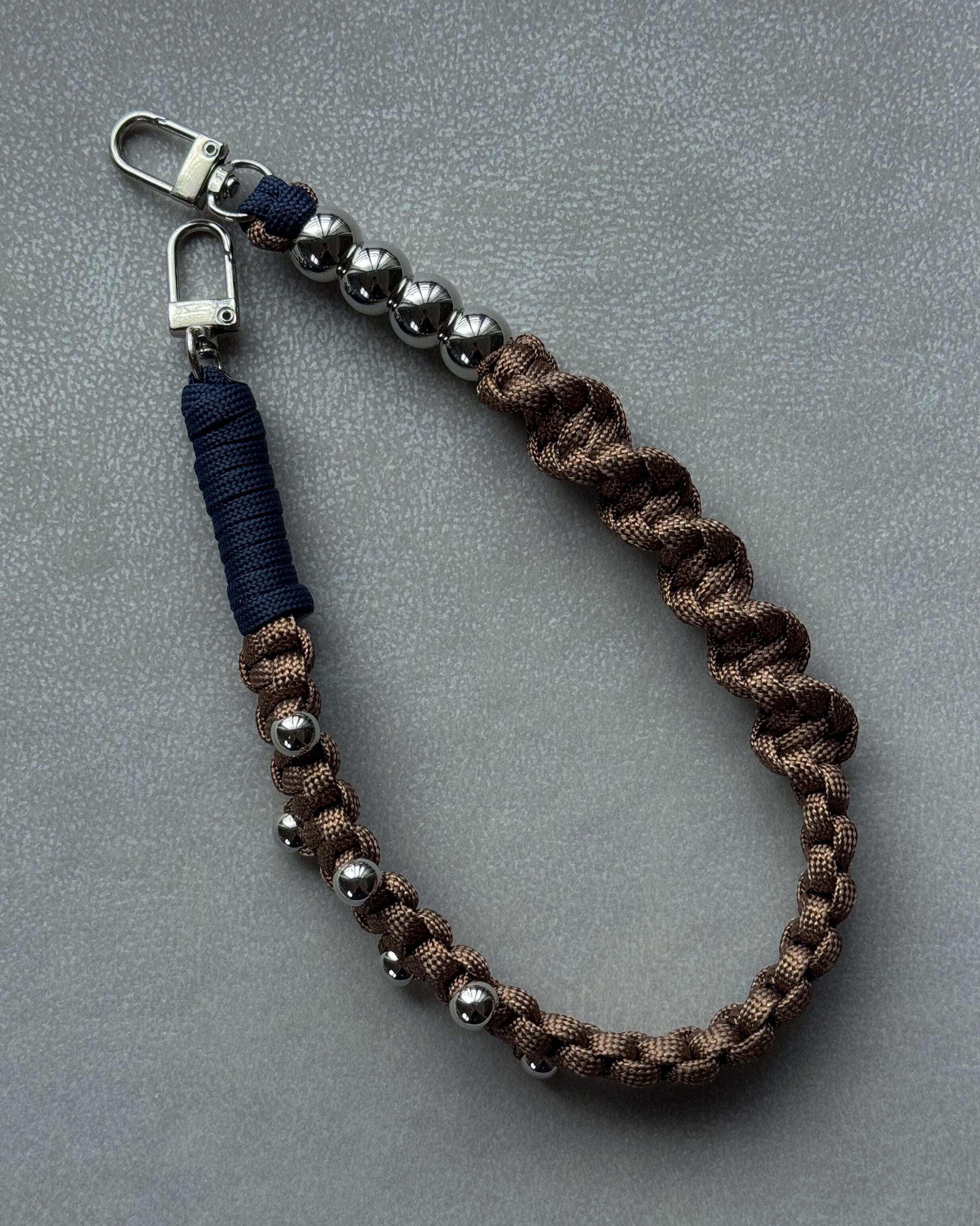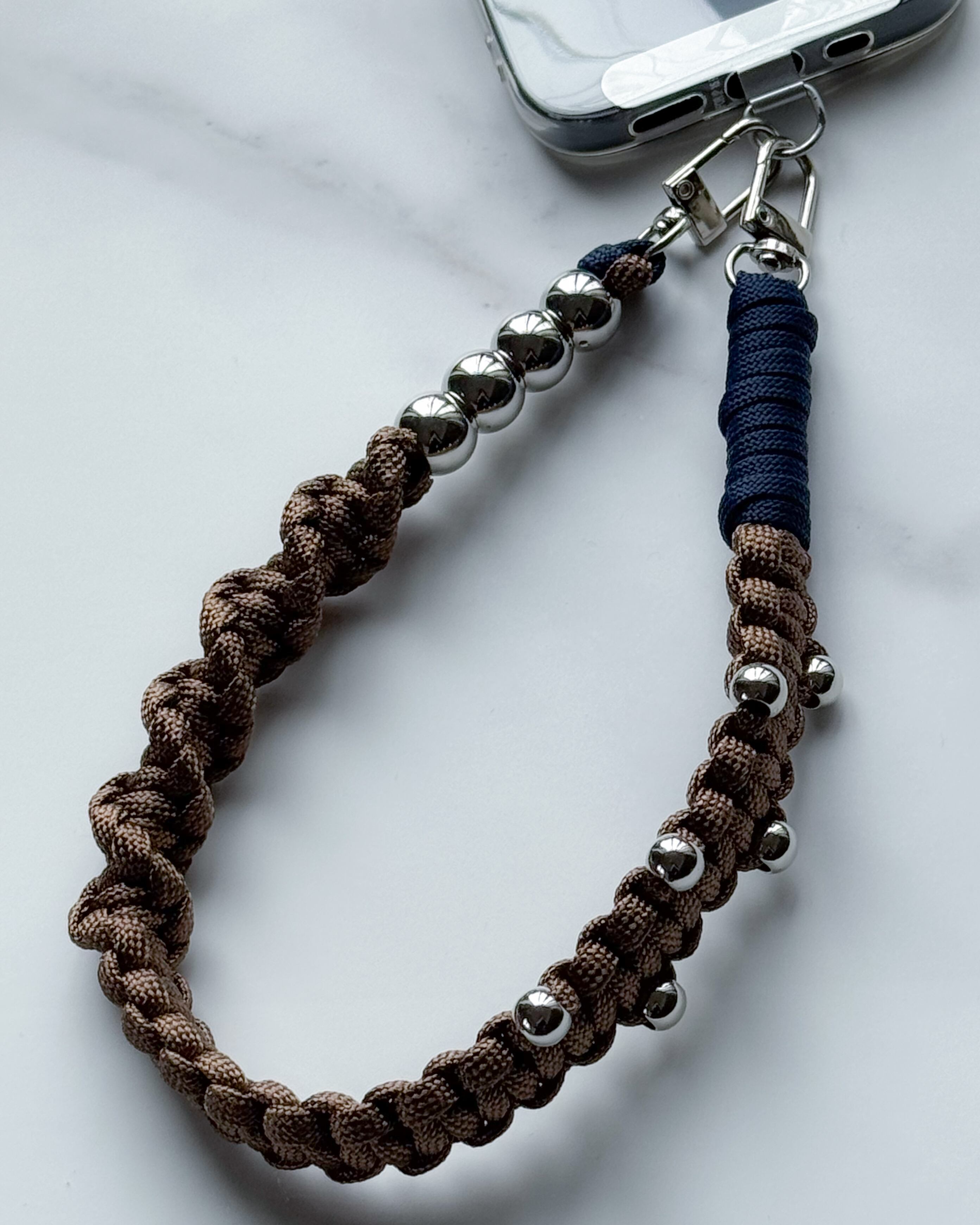 パラコードのミニマルな編み地に、シルバーパーツとチェーンをアクセントとして組み合わせ、ストラップでありながらアクセサリーのように楽しめるデザインに。
