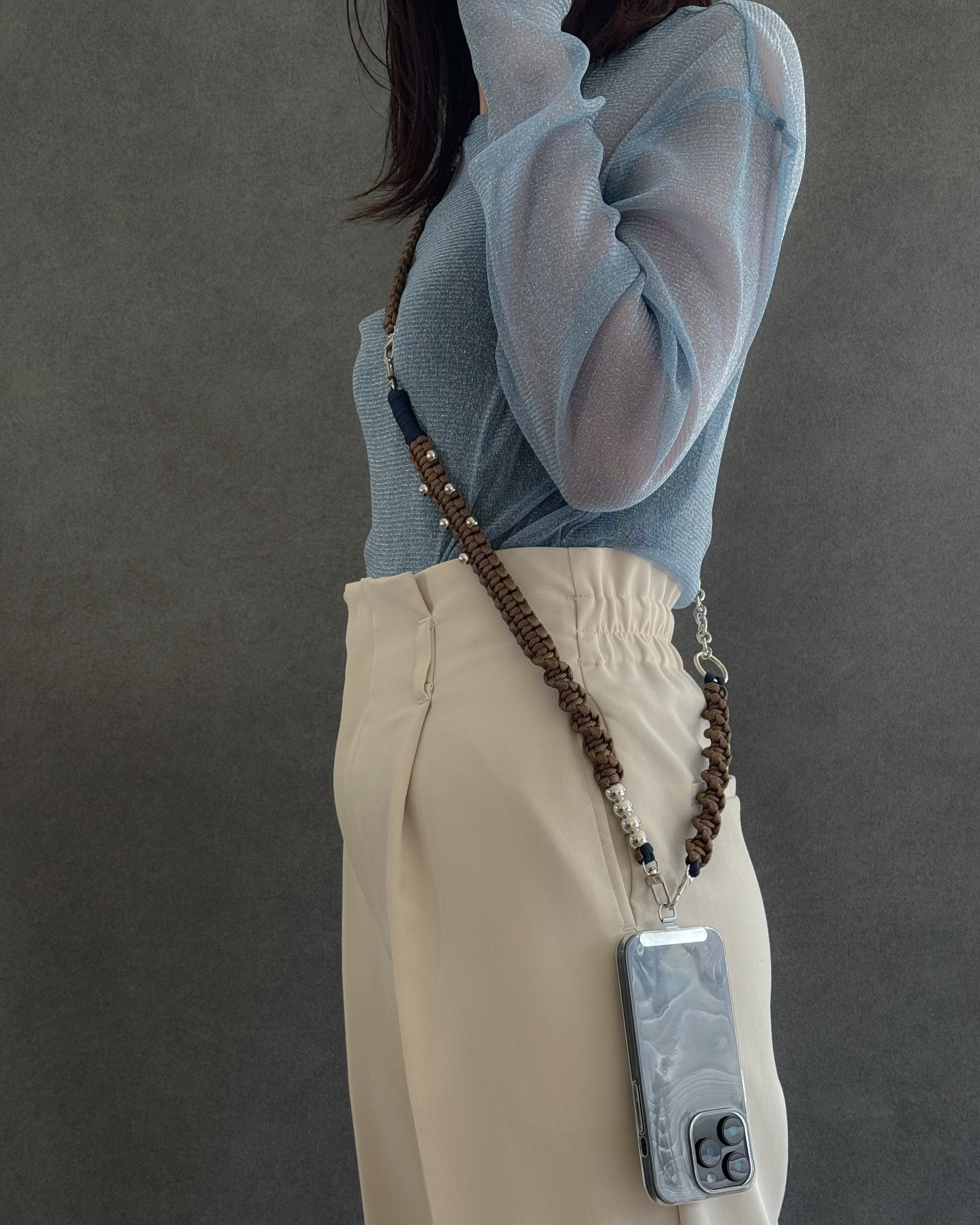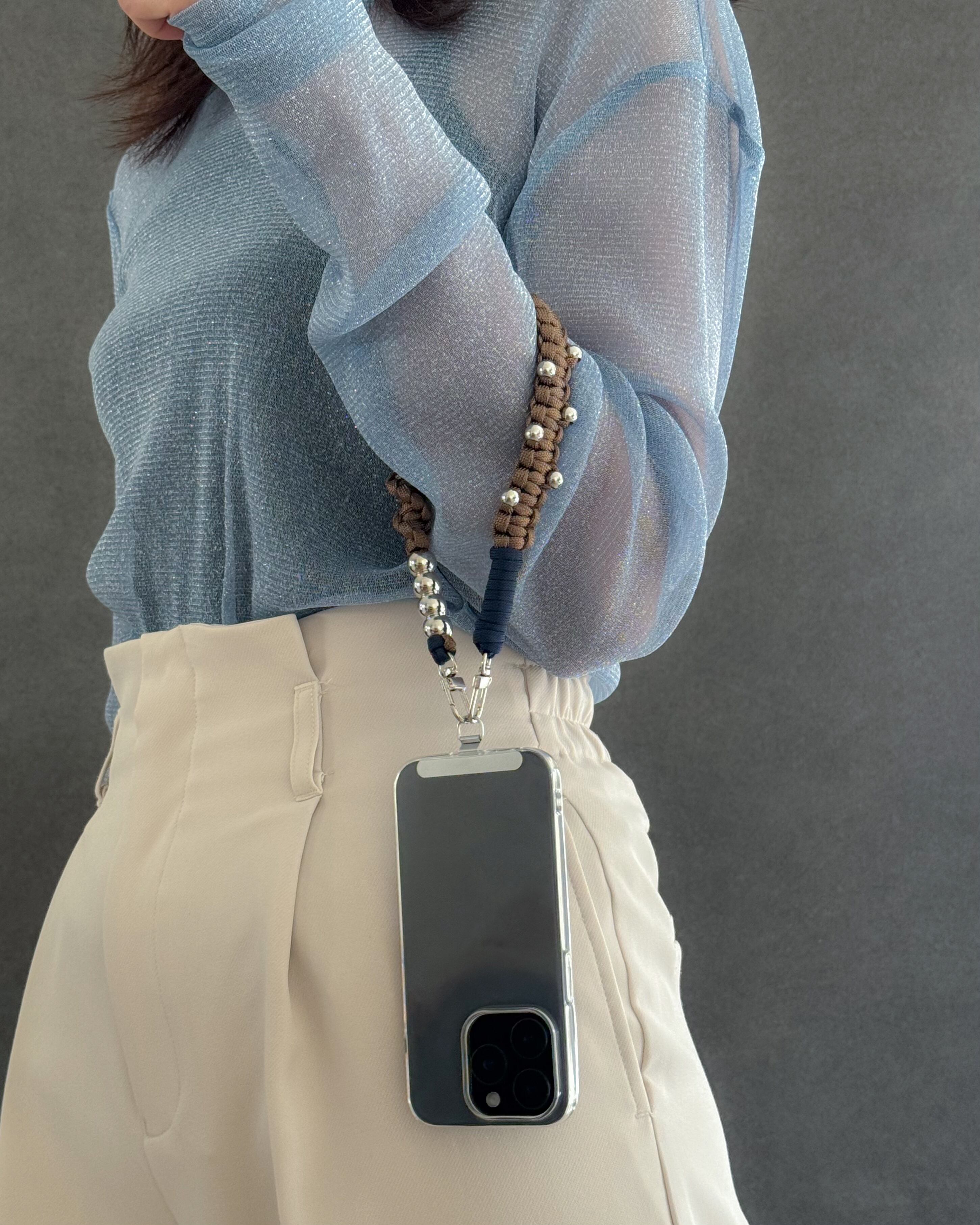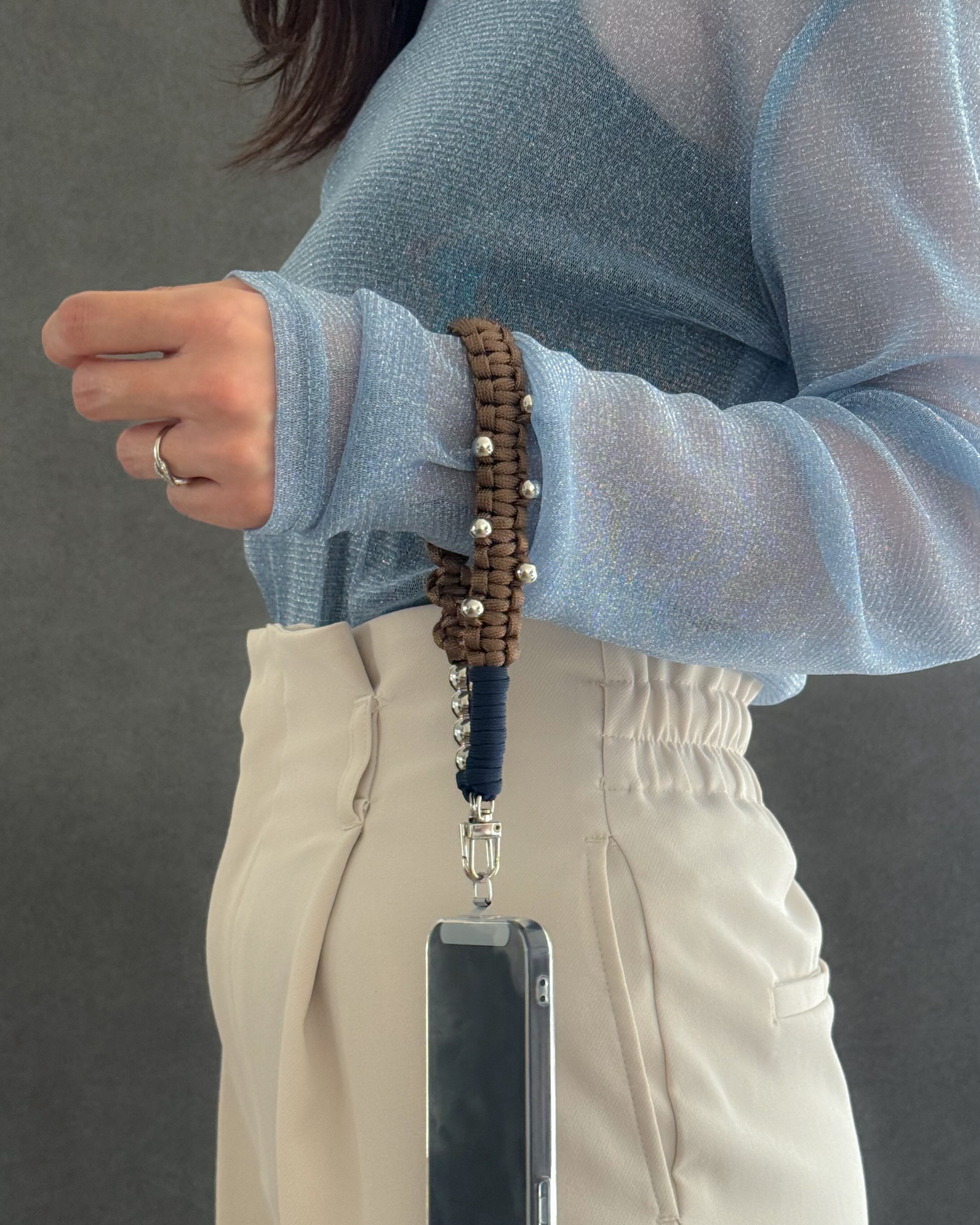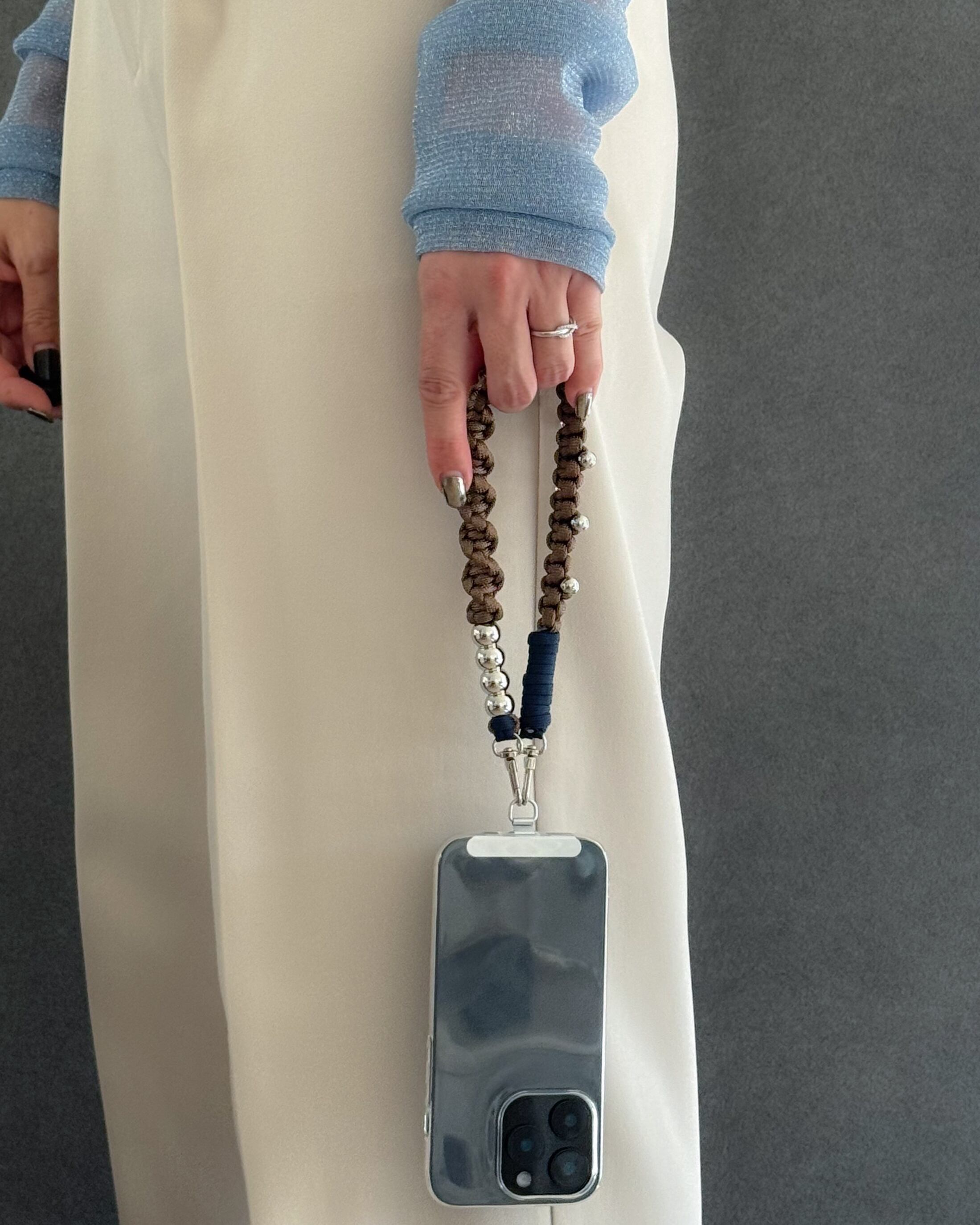 パラコードのミニマルな編み地に、シルバーパーツとチェーンをアクセントとして組み合わせ、ストラップでありながらアクセサリーのように楽しめるデザインに。