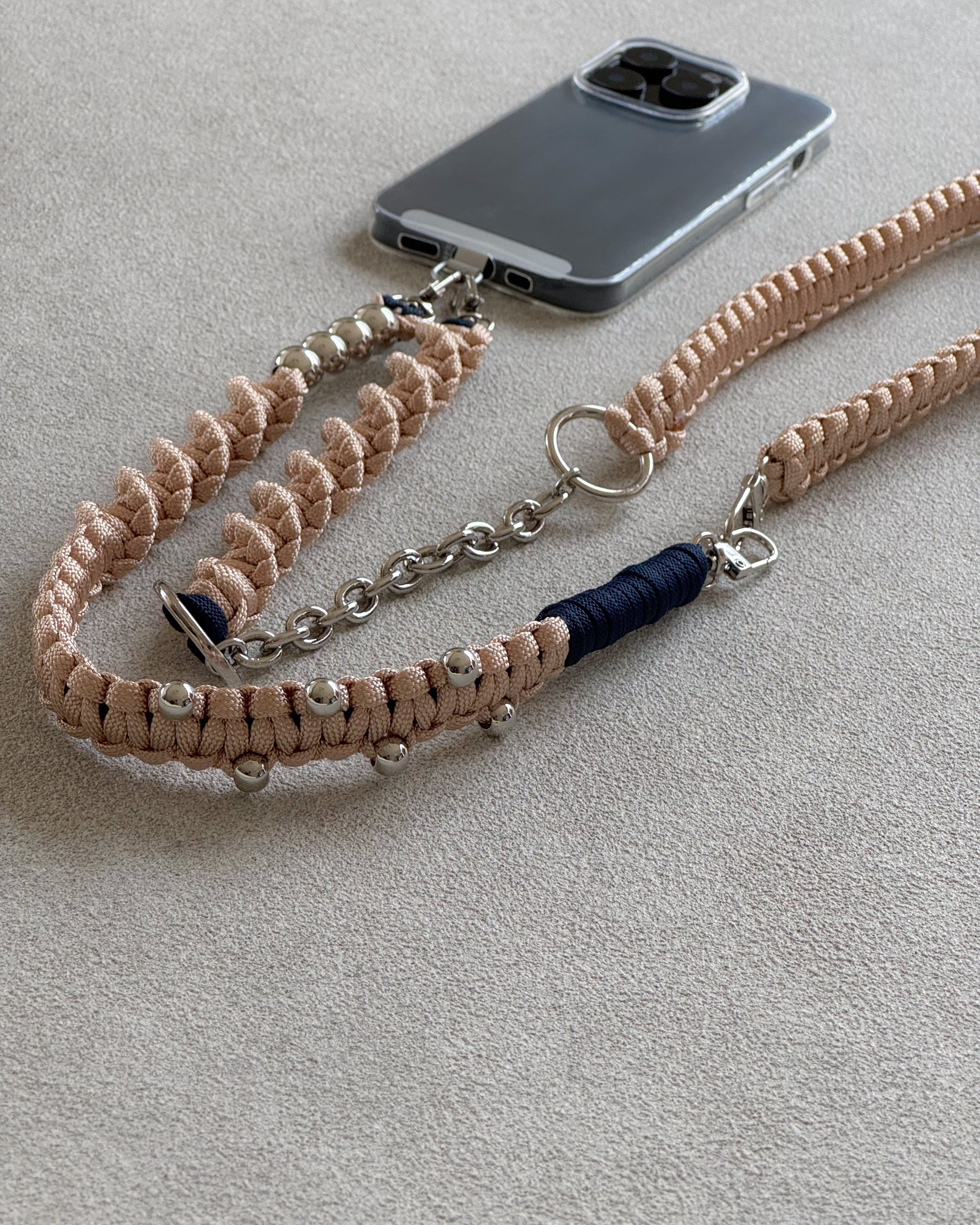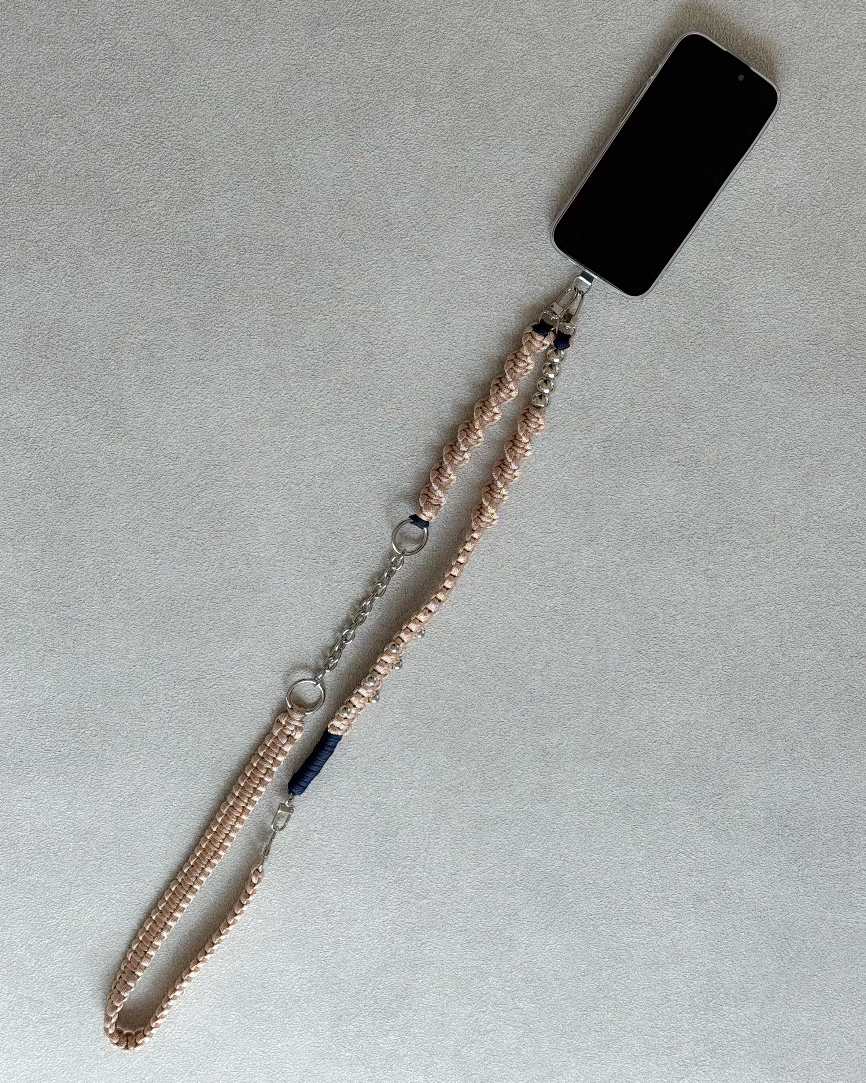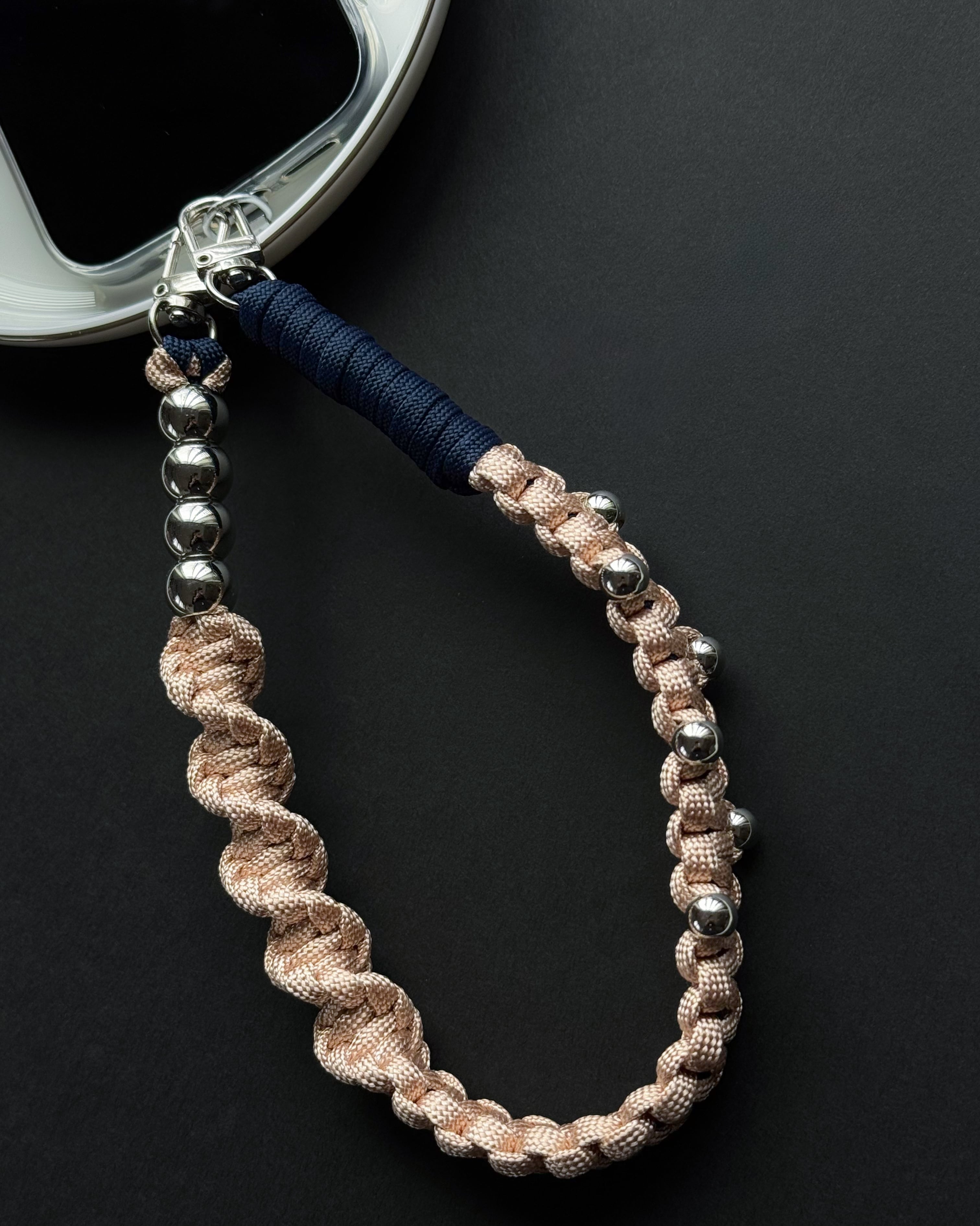 パラコードのミニマルな編み地に、シルバーパーツとチェーンをアクセントとして組み合わせ、ストラップでありながらアクセサリーのように楽しめるデザインに。