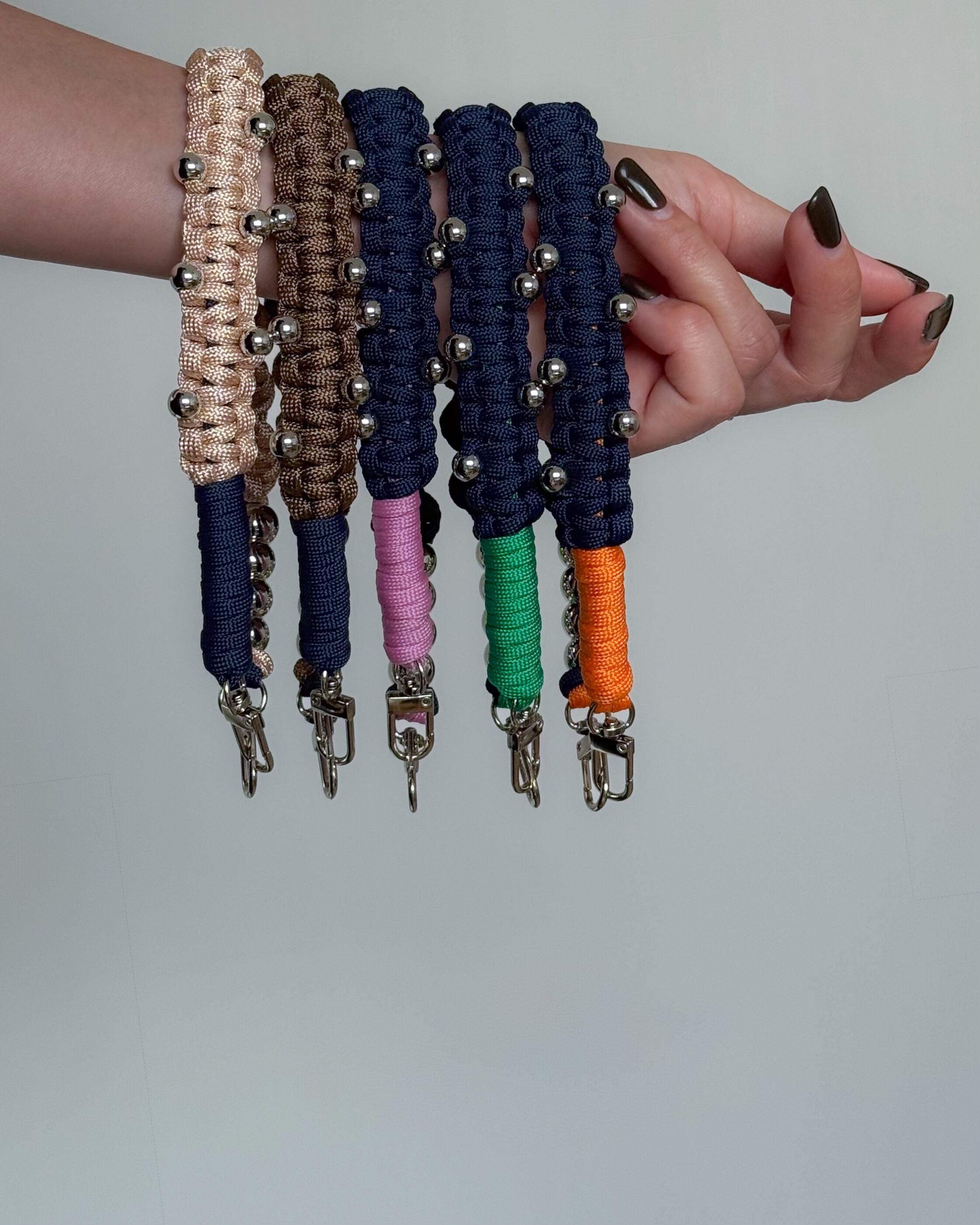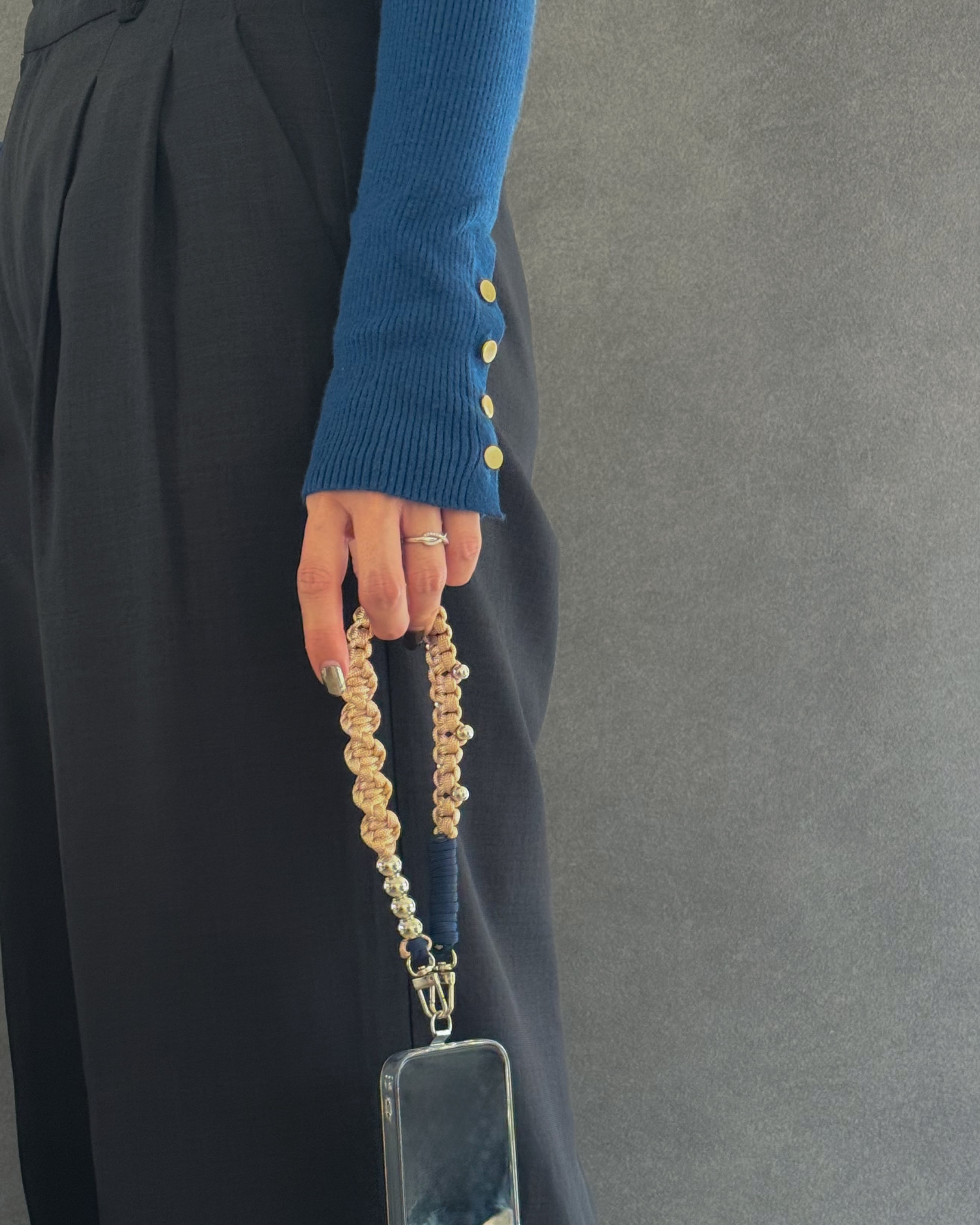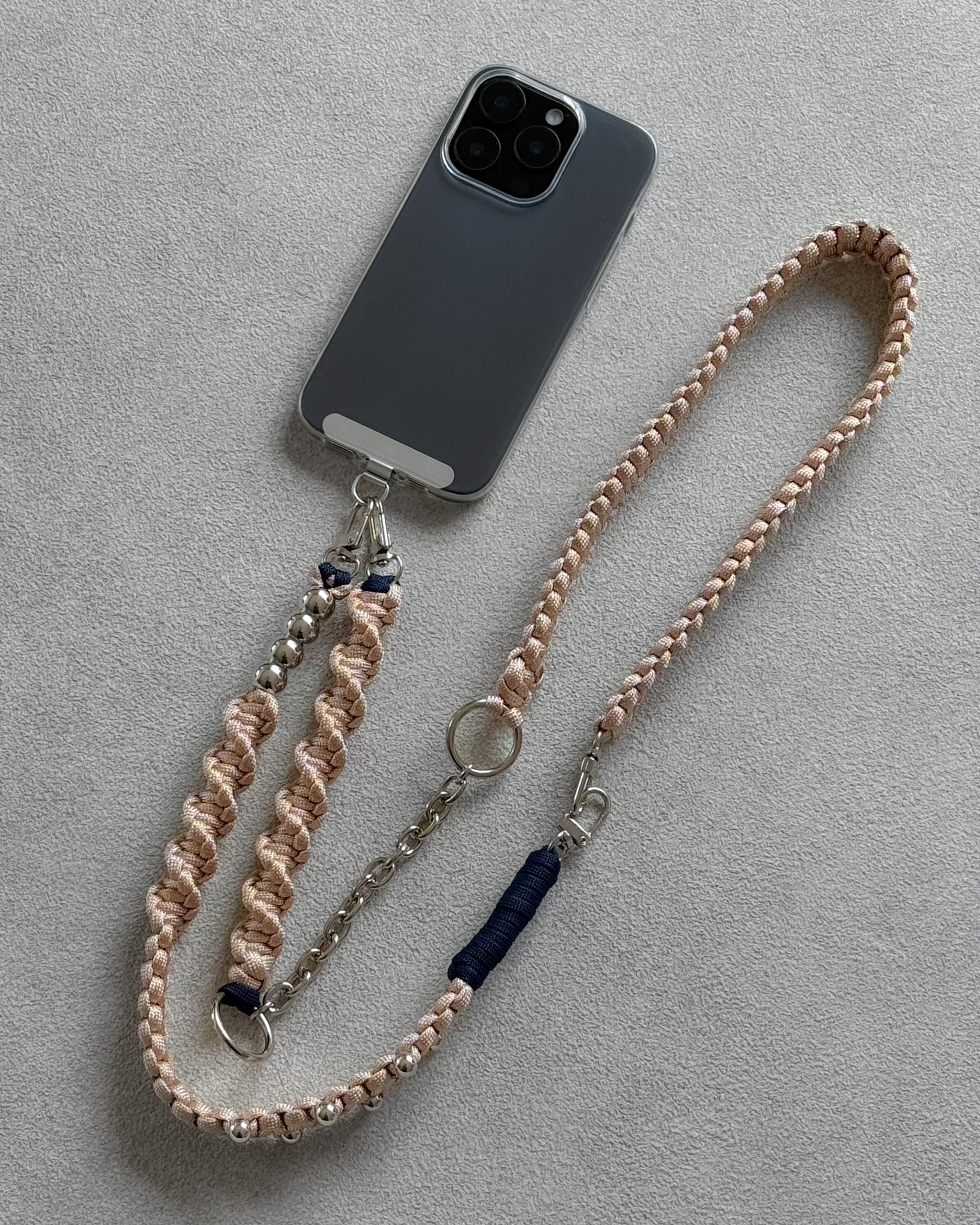 パラコードのミニマルな編み地に、シルバーパーツとチェーンをアクセントとして組み合わせ、ストラップでありながらアクセサリーのように楽しめるデザインに。