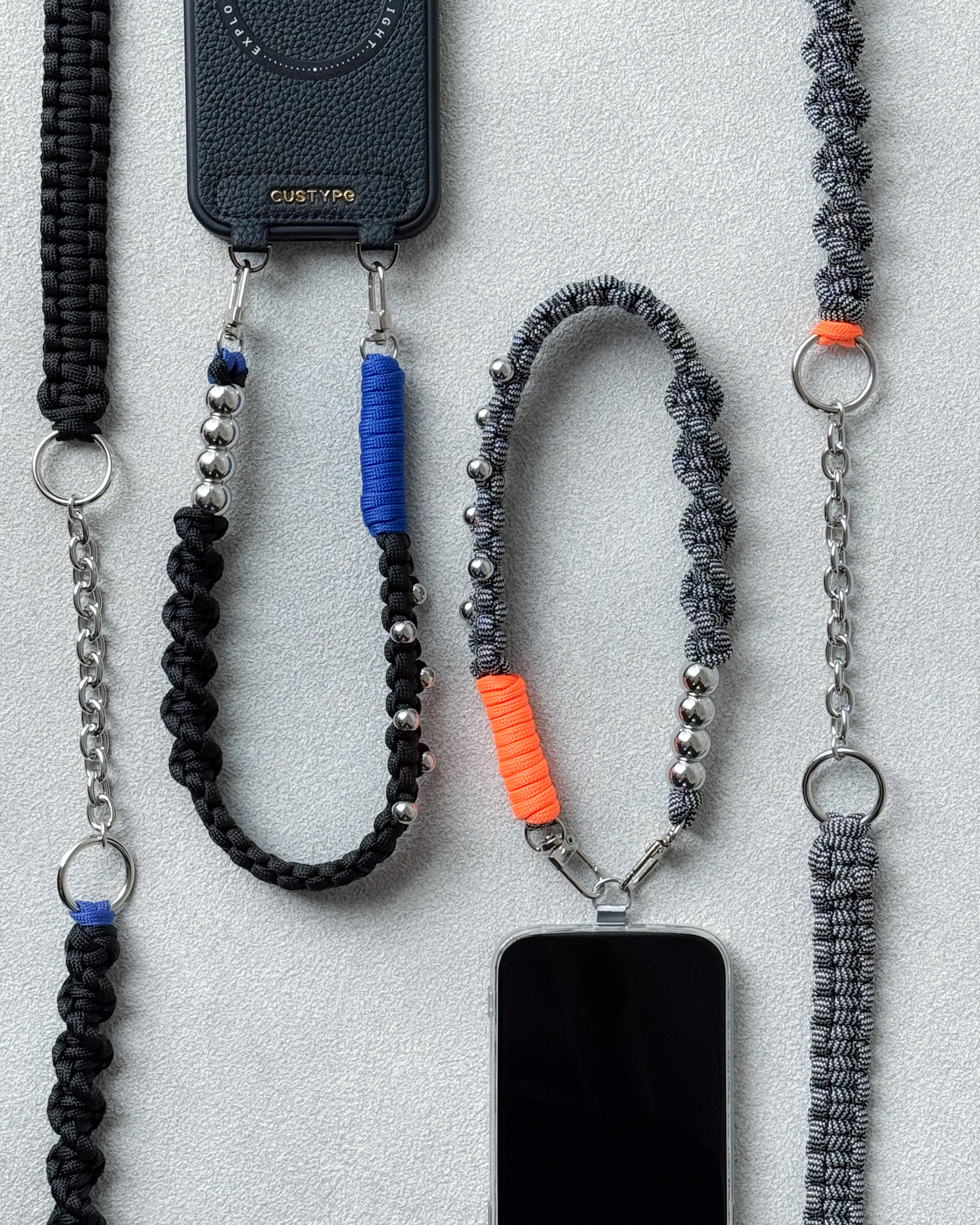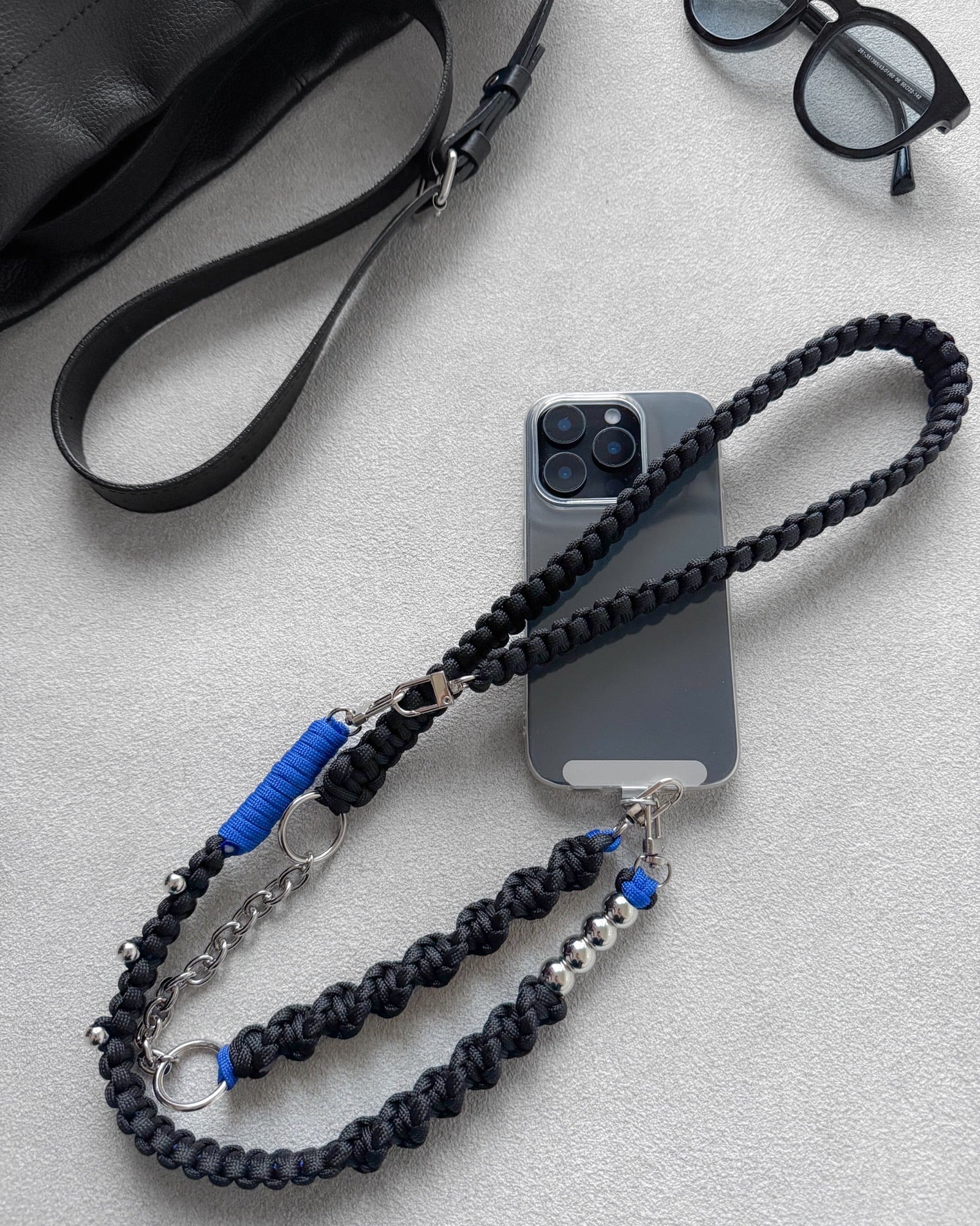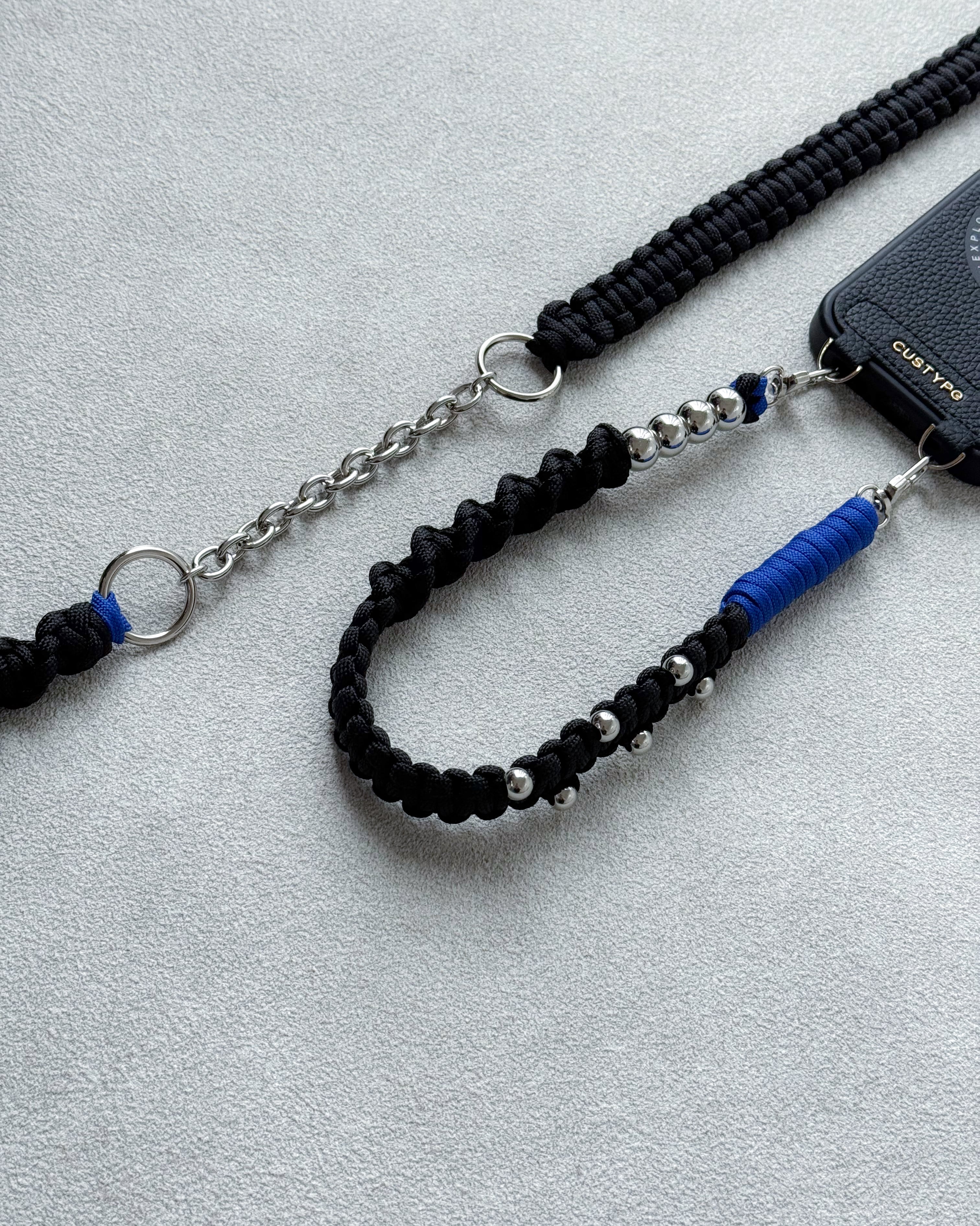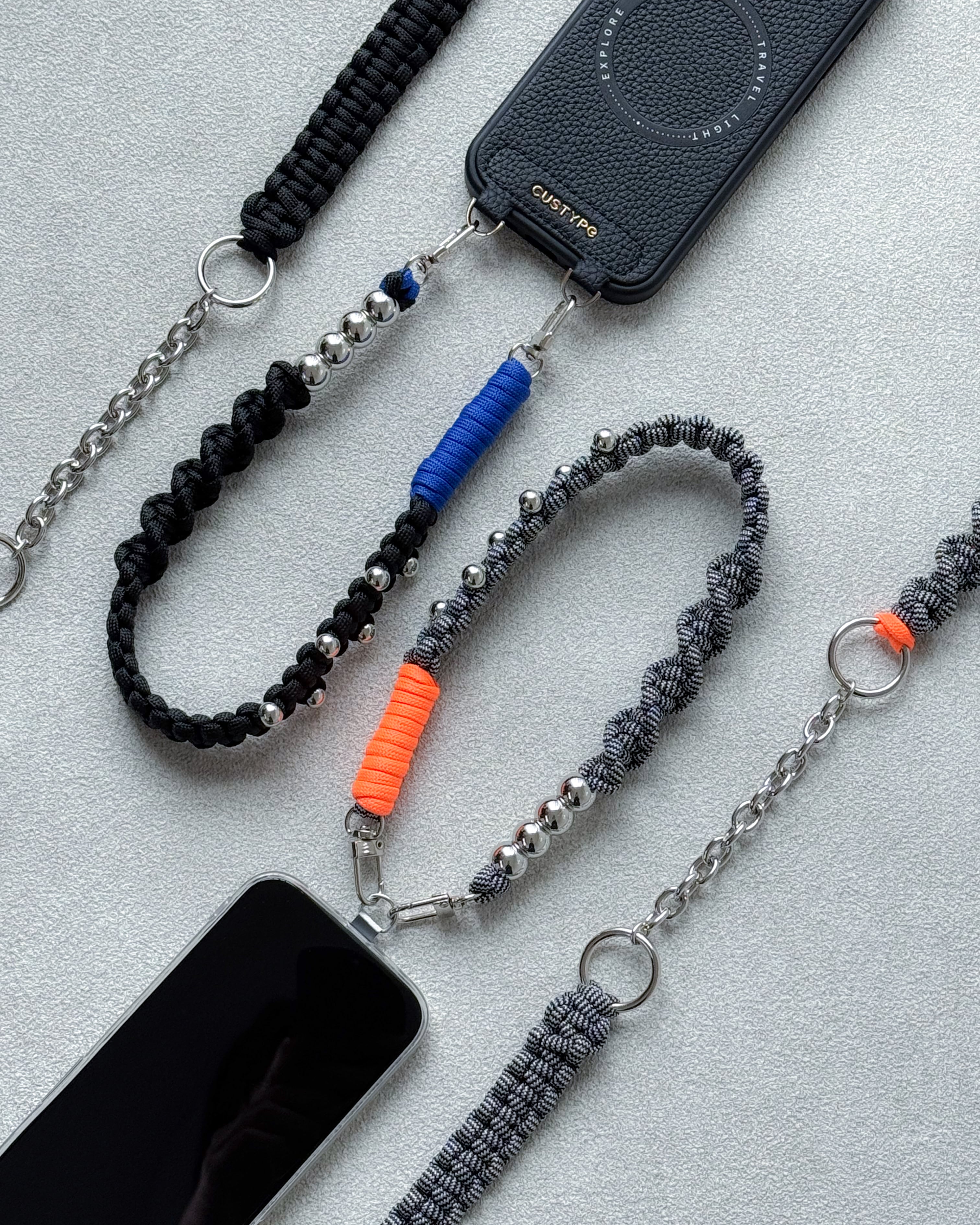 パラコードのミニマルな編み地に、シルバーパーツとチェーンをアクセントとして組み合わせ、ストラップでありながらアクセサリーのように楽しめるデザインに。