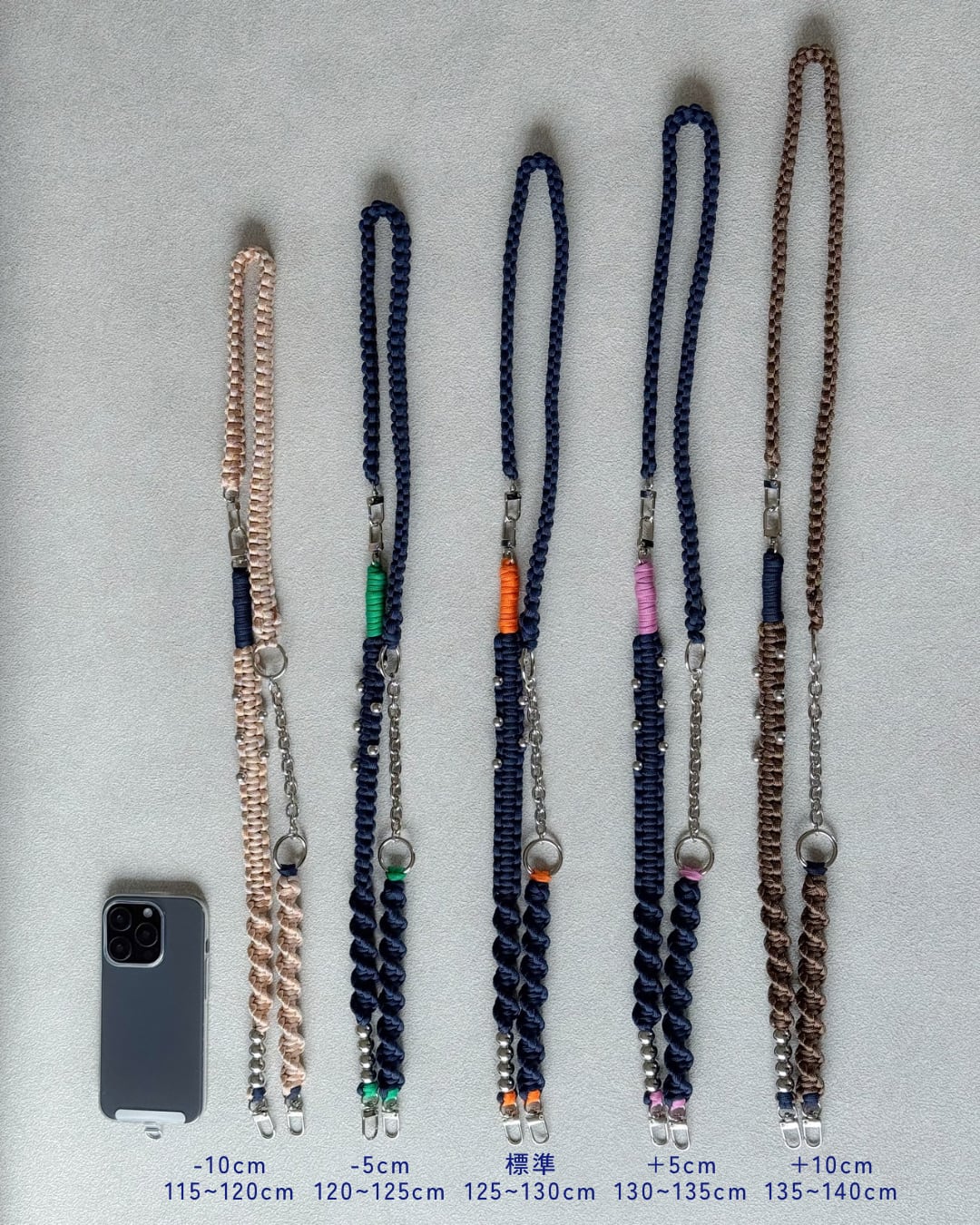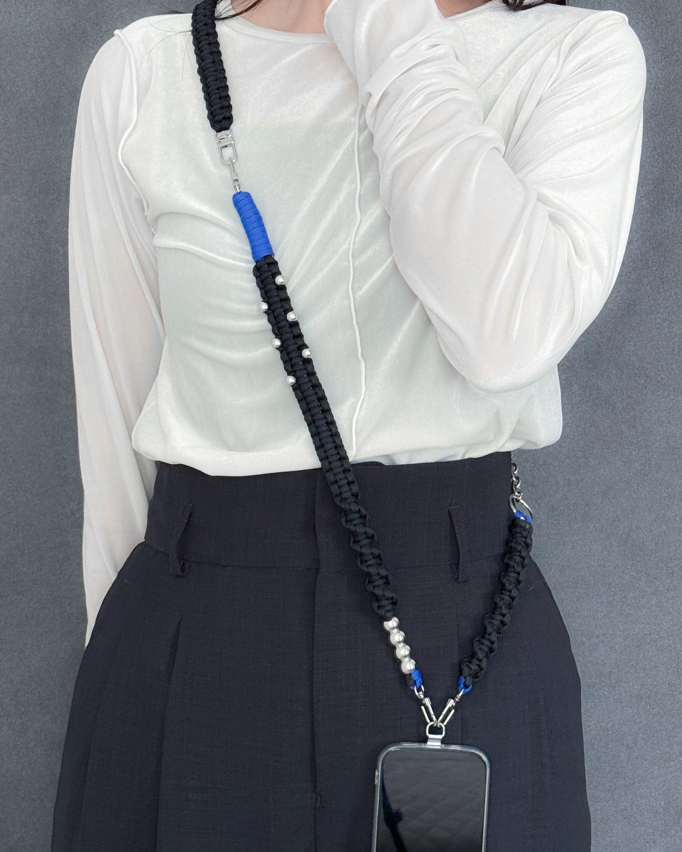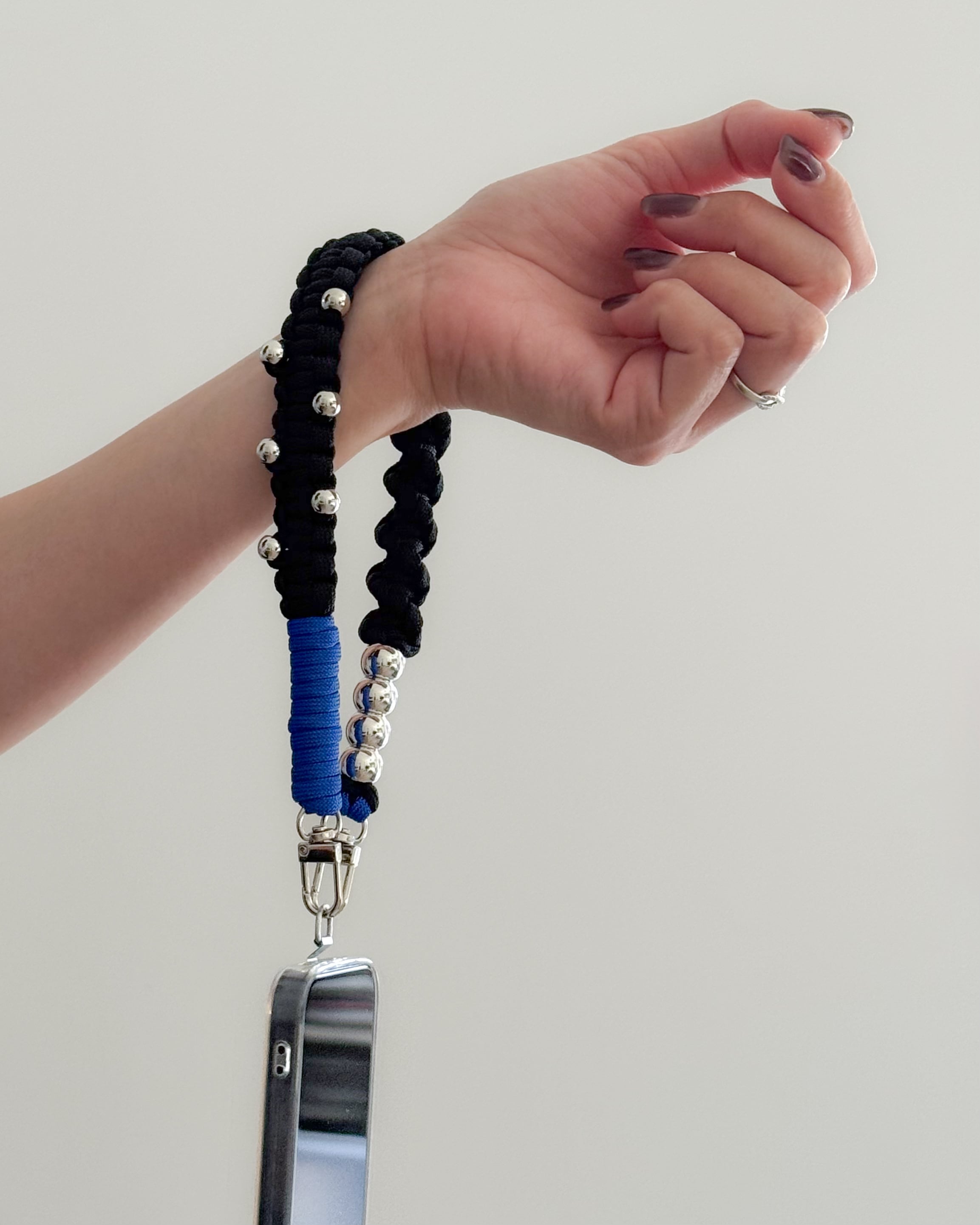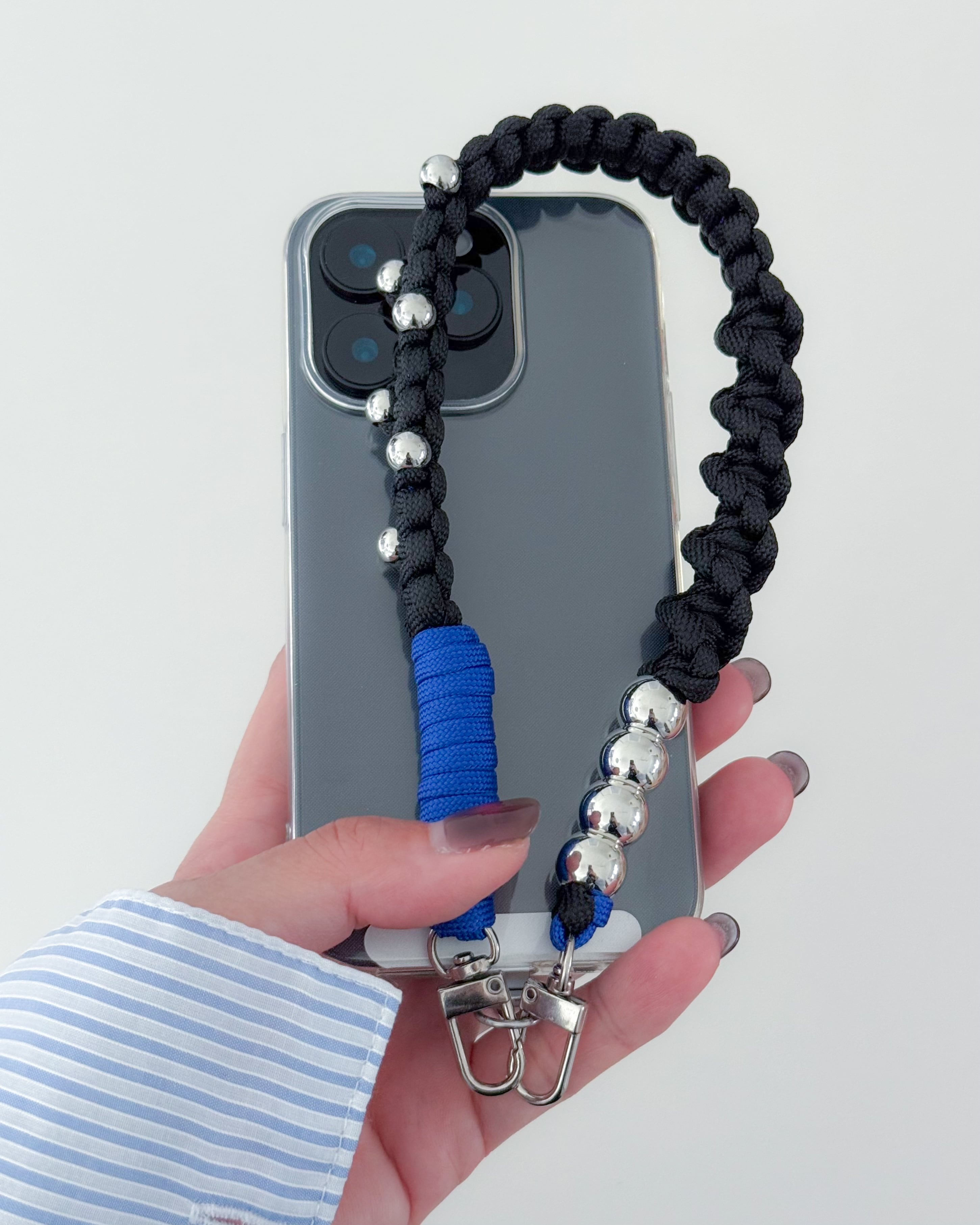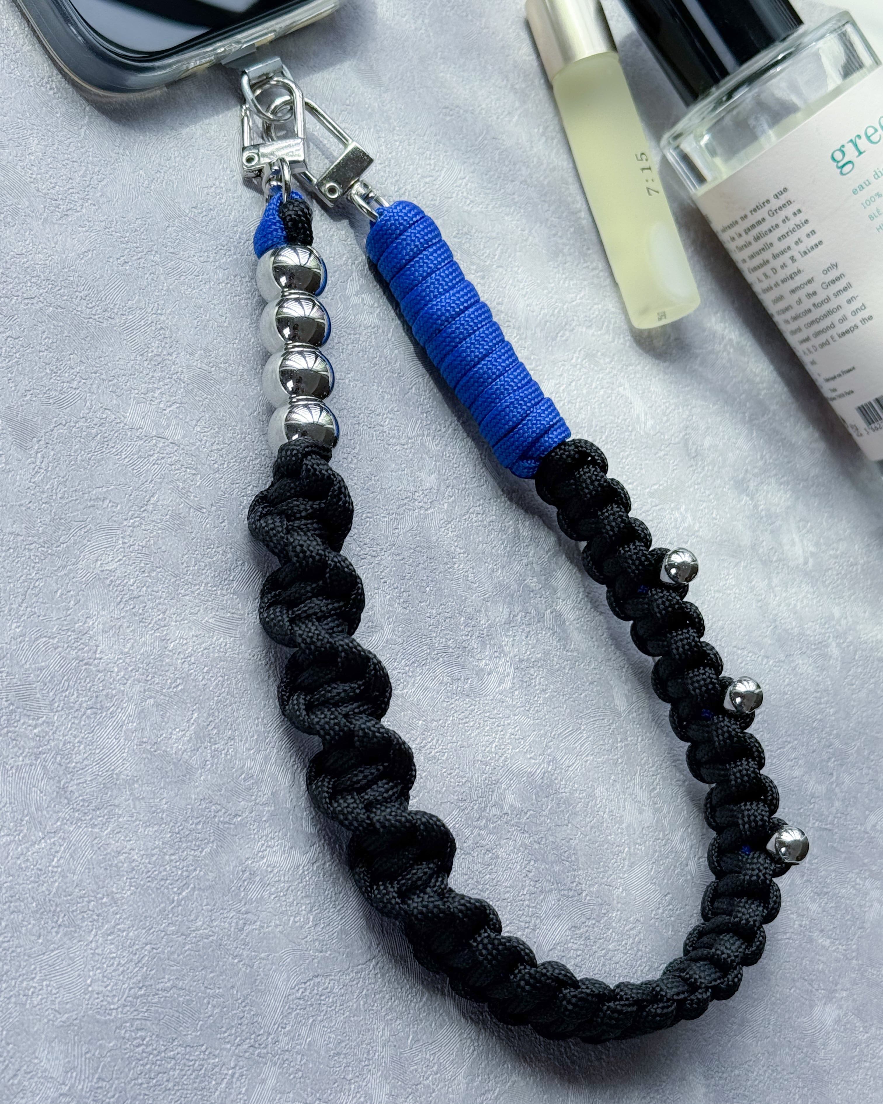 パラコードのミニマルな編み地に、シルバーパーツとチェーンをアクセントとして組み合わせ、ストラップでありながらアクセサリーのように楽しめるデザインに。