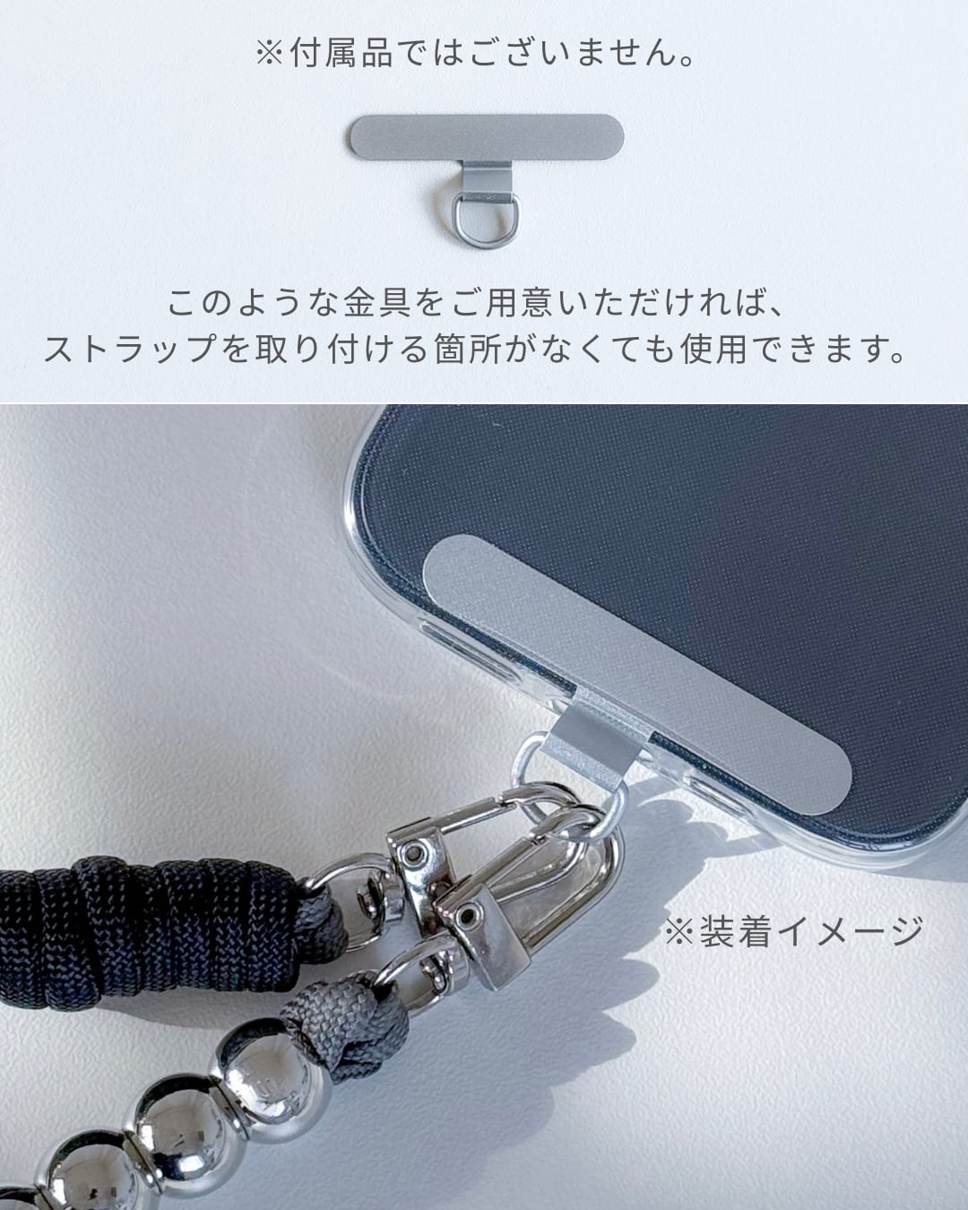 ※取り付けの際は、ストラップ取付口のあるスマホケース、または写真のような専用の金具をご使用ください。
